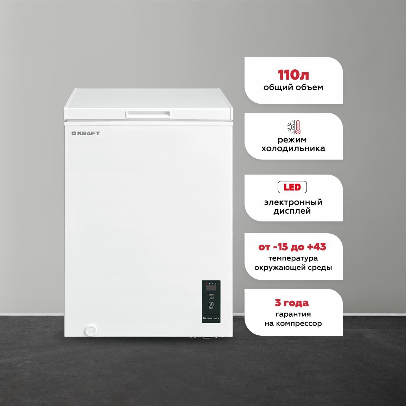 Мощность заморозки Kraft BD(W)-100BL составляет 4,5 кг/сутки. При отключении света морозильный ларь сохраняет низкую температуру в морозильной камере до 17 часов. При активации режима Суперзаморозка температура в камере достигает -30C. Низкий уровень шума не превышает 38 дБ. Рекомендуемый диапазон температур эксплуатации ларя от +10 до +43С.