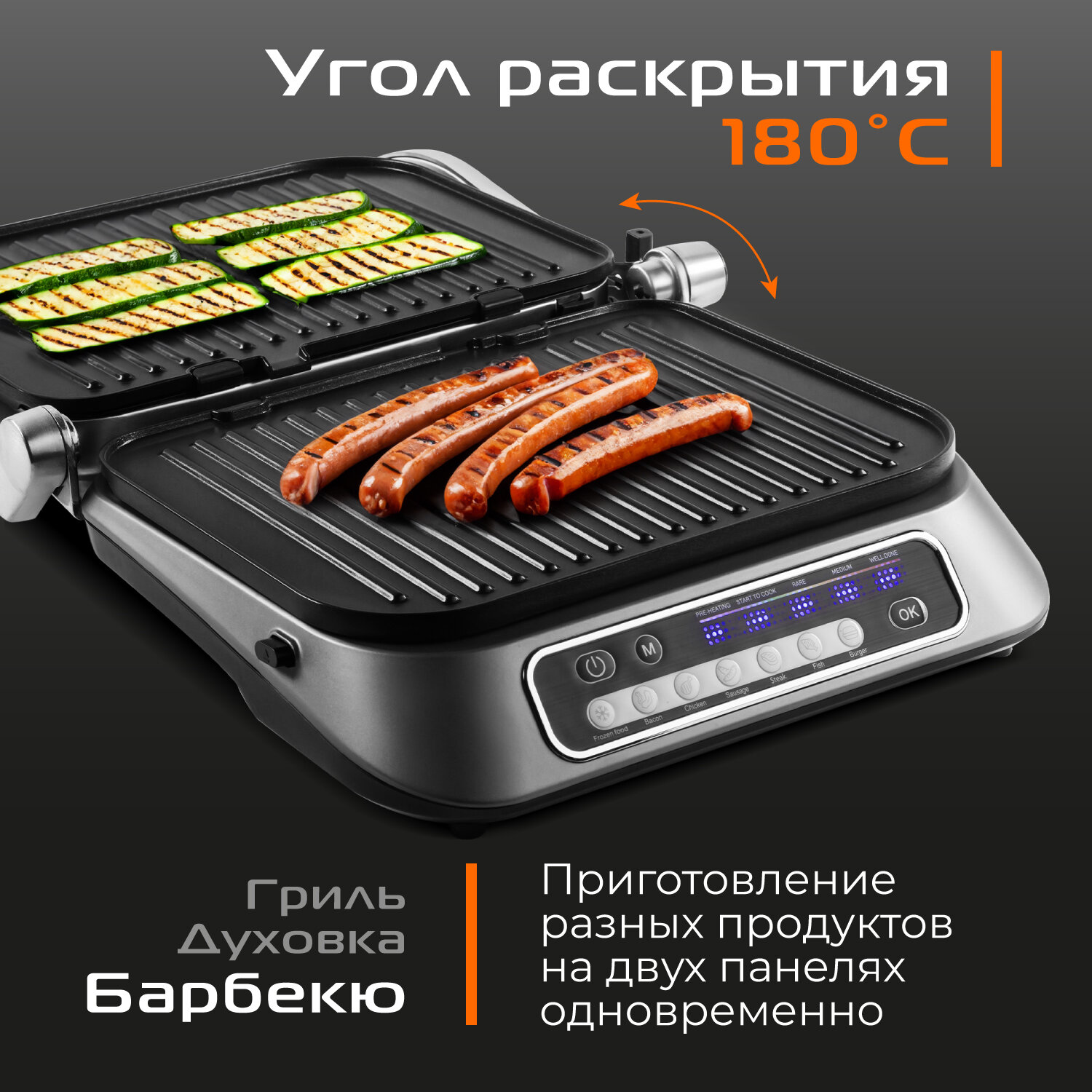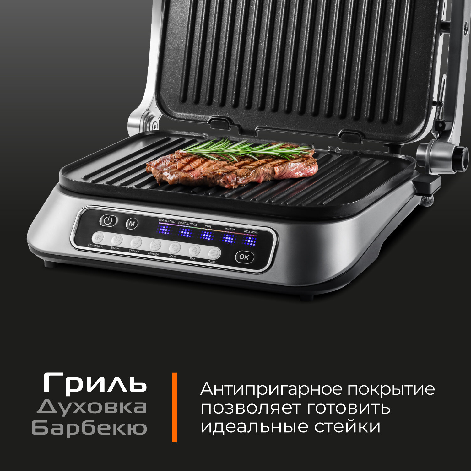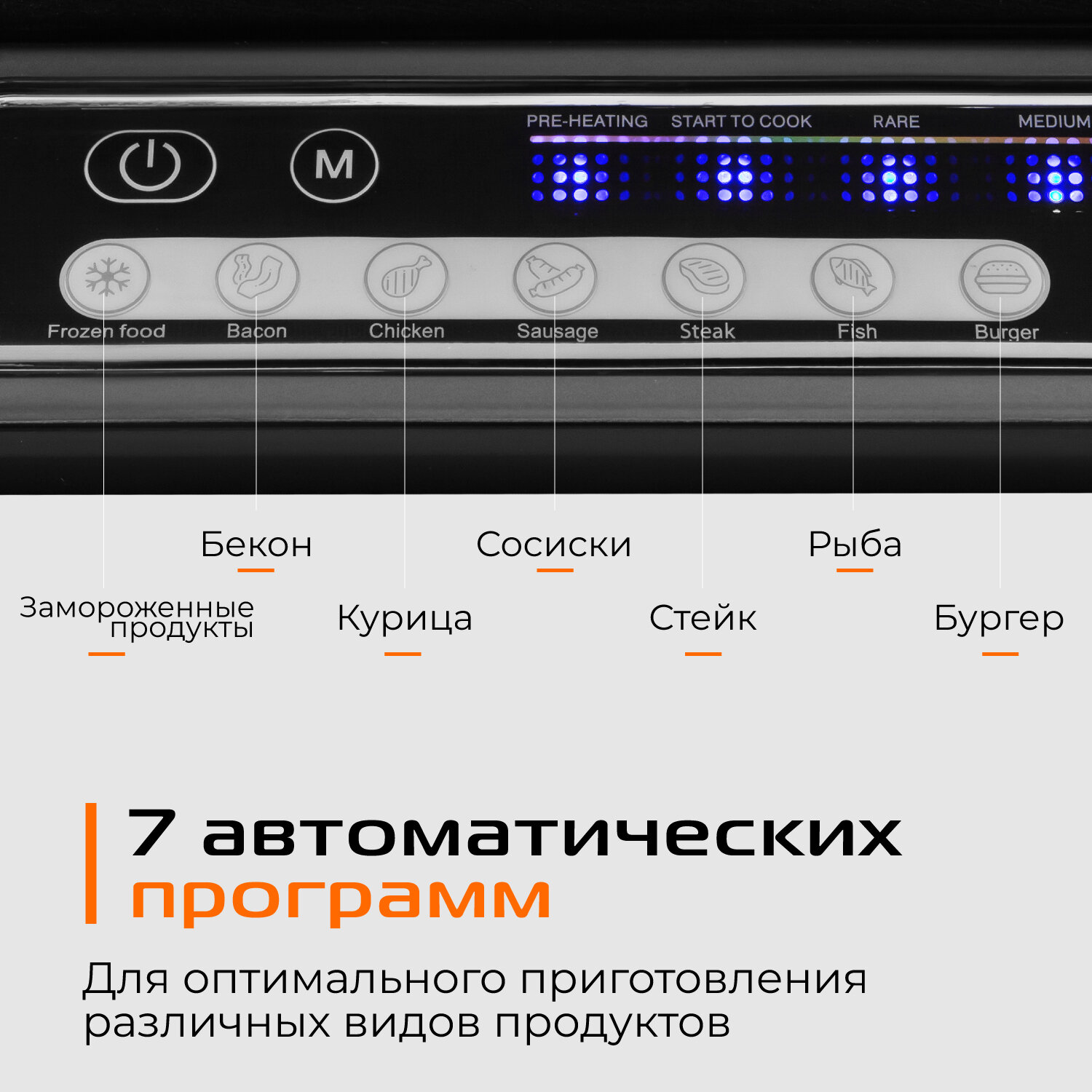 | Наш электрогриль для дома с большой варочной поверхностью и регулируемой температурой позволяет вам готовить все | от стейков и гамбургеров до овощей. В него встроены 7 автоматических программам: |