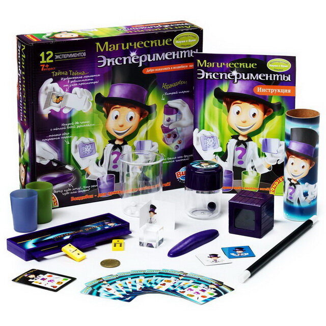 Французские опыты Науки с Буки, 12 экспериментов) Магические эксперименты. Добро пожаловать в волшебную страну науки! Любое чудо имеет логическое объяснение, набор Магические эксперименты поможет ребёнку не только весело провести время с друзьями, удивить и восхитить их, но и, что очень важно, поможет ребёнку разобраться в том, как это чудо происходит. Набор включает в себя красочную иллюстрированную инструкцию, инвентарь для проведения фокусов (экспериментов). Эксперименты: Хитрый шарик, забавная вертушка, магическое домино, волшебные стаканы, водонепроницаемая бумага, волшебные зеркала, липкая вода, волшебное притяжение, магические карты, стойкий цилиндр, пропавшая монета, кристальный кубик. Для детей от 7 лет.