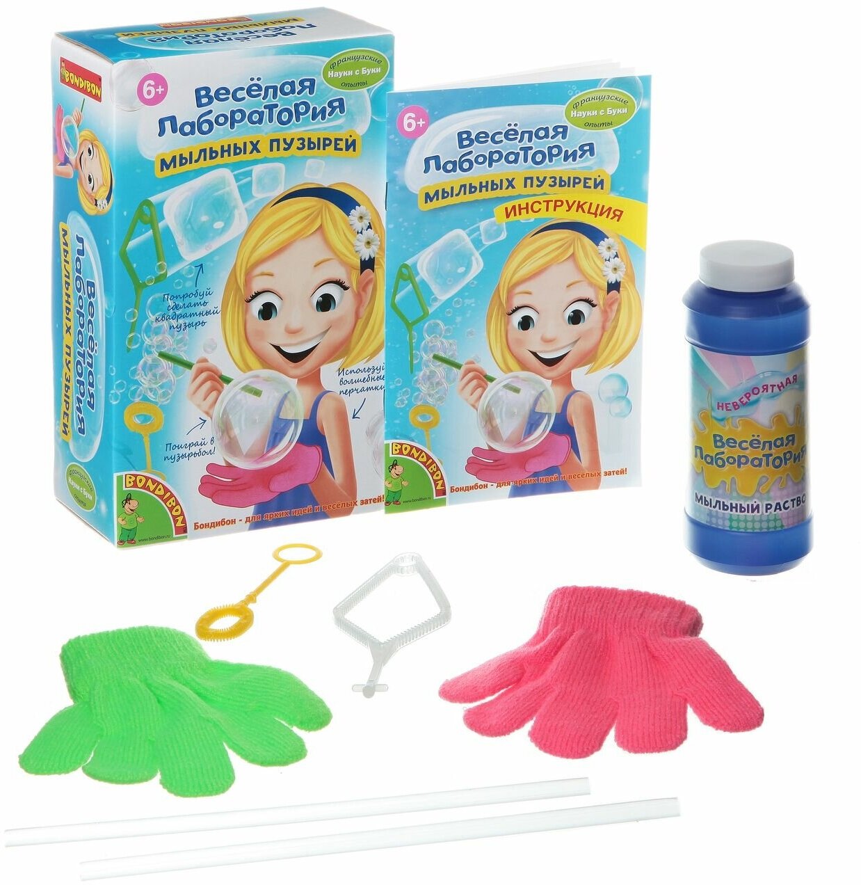 Французские опыты Науки с Буки, Весёлая лаборатория. Этот игровой набор позволит проводить многочисленные эксперименты, выдувая разнообразные мыльные пузыри. И не только привычные шарики, но и кубики, пузырь в пузыре и многое другое. Кроме этого, в комплект входят особые перчатки, которые позволят осуществлять перебрасывания мыльных пузырей друг другу, трубочки, которые будут создавать бури из пузырей и так далее. Ребенок станет настоящим фокусником, проводя эксперименты с мыльным раствором, разовьет фантазию и воображение, аккуратность и внимательность.