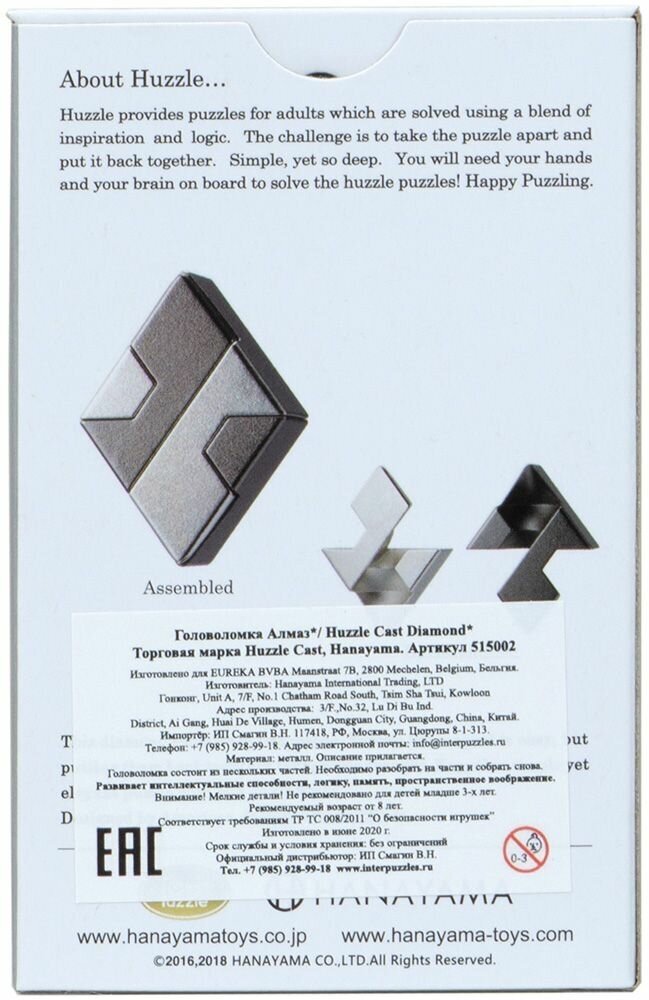 Линейка Huzzle Cast от японской компании Hanayama – это качественные металлические головоломки высокого уровня сложности, которые могут послужить отличным подарком как увлечённому фанату головоломок, так и просто человеку с пытливым умом. Чтобы решить головоломку, вам надо сначала разобрать её, а потом собрать. Причудливые формы и конструкции тщательно продуманы профессиональными создателями головоломок из стран всего мира и опираются на математические расчёты и законы физики. Качественное исполнение из металла не только гарантирует долгий срок эксплуатации, что значит, что пазл вполне может порадовать даже ваших внуков, но и делает процесс разгадки гораздо приятнее. У каждой головоломки есть своя история, какой-либо образ и ключевое слово, стоящее за её созданием и задающее ход мысли для разгадки.