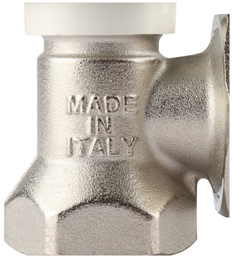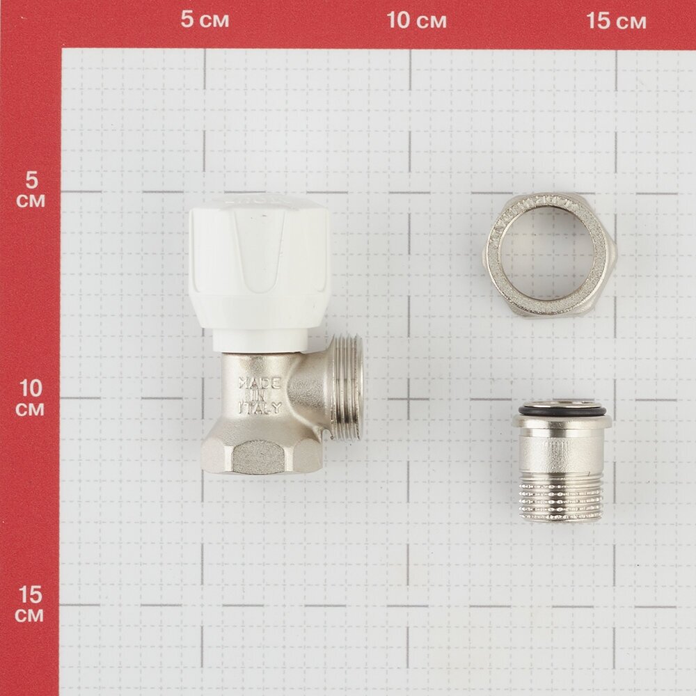**Клапан уголовой для радиатора** используется для ручной регулировки подачи теплоносителя в радиатор отопления. Изготовлен из никелированной латуни. Присоединение осуществляется с помощью резьбового соединения размером 1/2". Сделано в Италии. Гарантия производителя — 2 года.