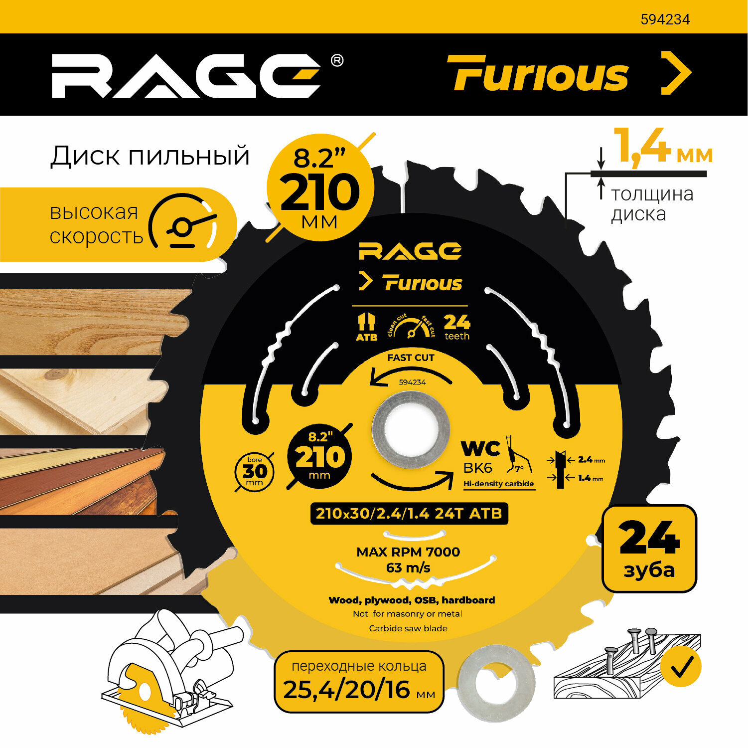 Диск пильный по дереву Rage Furious 24Т 210x30x1.4 мм (210/24)