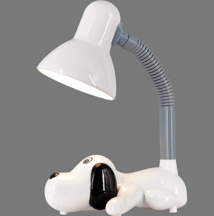 Светильник настольный Собачка предназначен для освещения рабочего места ребёнка, места его учёбы, чтения, занятия творчеством. Этот светильник украсит интерьер комнаты ребёнка. Устойчивое основание изготовлено из пластика, плафон - из металла. Можно использовать с любыми типами лампочек, в том числе со светодиодными. С выключателем на основании. Стиль детский.