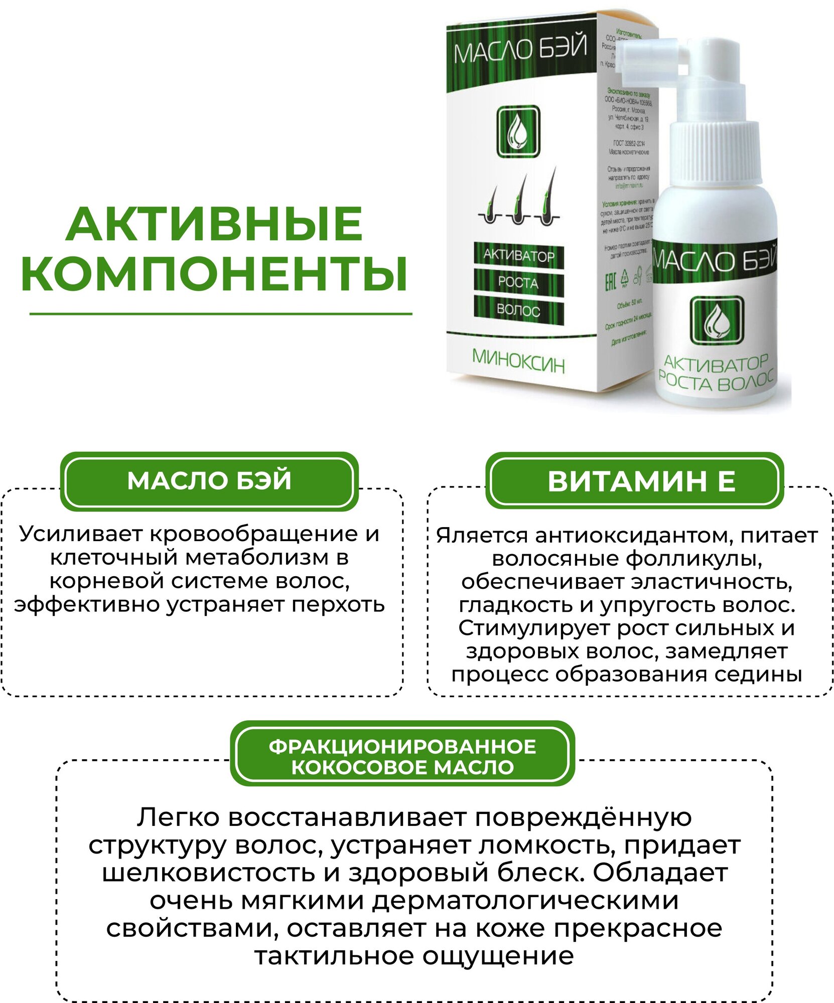 Натуральный комплекс байевого и кокосового масел с добавлением витамина Е специально разработан для активации роста волос. Рекомендуется как для женщин, так и для мужчин. Подходит для восстановления волос после родов и кормления грудью. Масло Бэй марки МИНОКСИН произведено по холодной технологии с сохранением всего комплекса биологически активных веществ, имеет мягкий и натуральный аромат в отличие от эфирного масла. Масло Бэй усиливает кровообращение и клеточный метаболизм в корневой системе волос, эффективно устраняет перхоть. Увлажняет кожу головы, укрепляет волосяные луковицы, останавливает выпадение волос и эффективно влияет на их рост. Также масло Бэй оказывает положительное влияние на толщину волоса и его внутреннюю структуру. Масло наносить на сухую кожу головы, втереть массирующими движениями, оставить на 60 минут, затем смыть шампунем. Применяется для активации роста бороды и усов. Состав масляный экстракт Бэй на кокосовом масле, витамин Е.Состав:масляный экстракт Бэй (на фракционированном кокосовом масле), витамин Е.