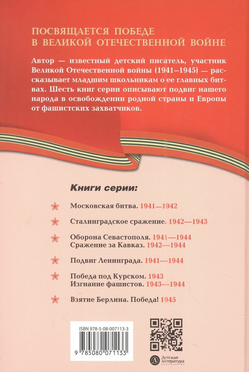 Автор - известный детский писатель, участник Великой Отечественной войны (1941-1945) - рассказывает младшим школьникам о ее главных битвах: шесть книг серии описывают подвиг нашего народа в освобождении родной страны и Европы от фашистских захватчиков. Шестая книга серии посвящена взятию Берлина и победе над фашизмом (1945).