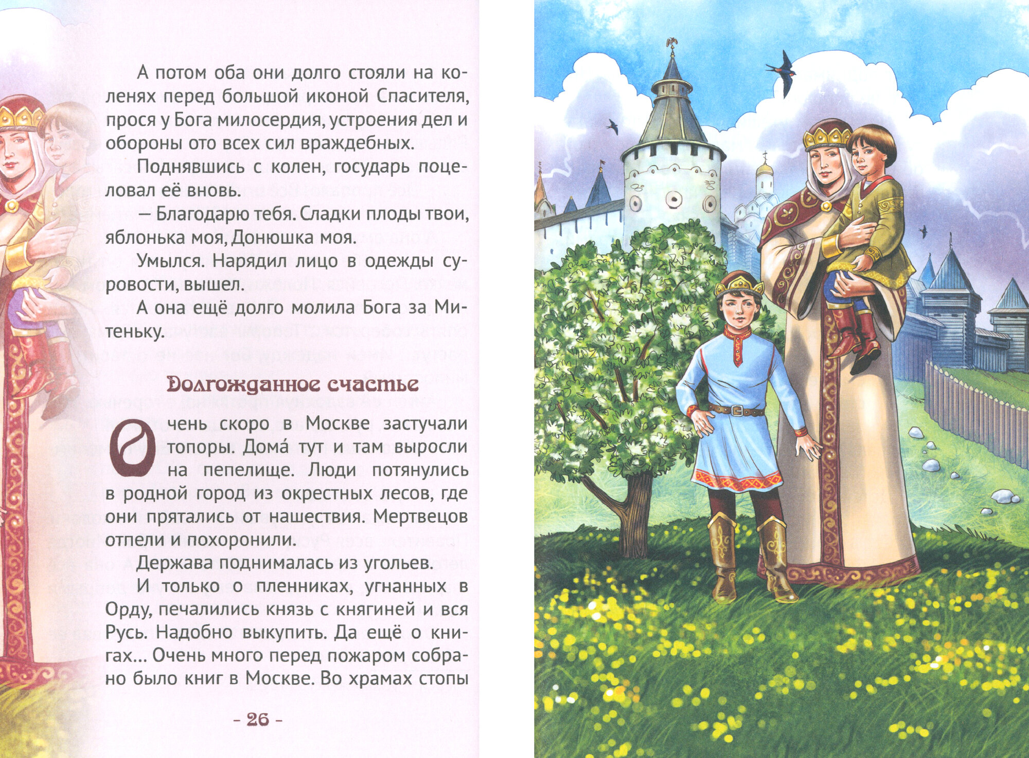 Книга Дмитрия Володихина "Княгиня Евдокия Московская - цветущая яблоня" расскажет детям и взрослым о жизни супруги великого князя Димитрия Донского. Имя "Евдокия" означает "благоволение", и это во многом определило судьбу и земной путь этой удивительной русской женщины. Княгиня вышла замуж по любви и пронесла эту любовь через всю свою жизнь. Их брак с Димитрием был благословлён самим Сергием Радонежским, бывшим духовным наставником великокняжеской четы. Евдокия Димитриевна не только подарила мужу 12 детей, но и была всегда верной подругой, опорой и утешением для героя Куликовской битвы. "Ты словно яблоня в цвету, и птицы в листве твоей поют!" - повторял он ей в течение всего их супружества. А оставшись в 36 лет вдовой, княгиня сохранила верность любимому и посвятила свою жизнь служению Богу и людям, за что Православная Церковь прославила Евдокию (в монашестве - Евфросинию) в лике преподобных.