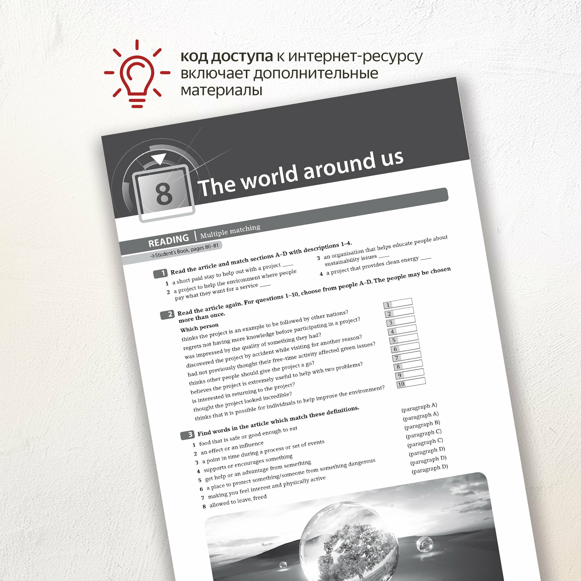 Рабочая тетрадь без ответов обеспечивает полную отработку материала, представленного в учебнике. Каждый тематический раздел включает контрольные задания Progress check. В конце рабочей тетради находится полная версия экзамена международного стандарта Cambridge for Schools exam.