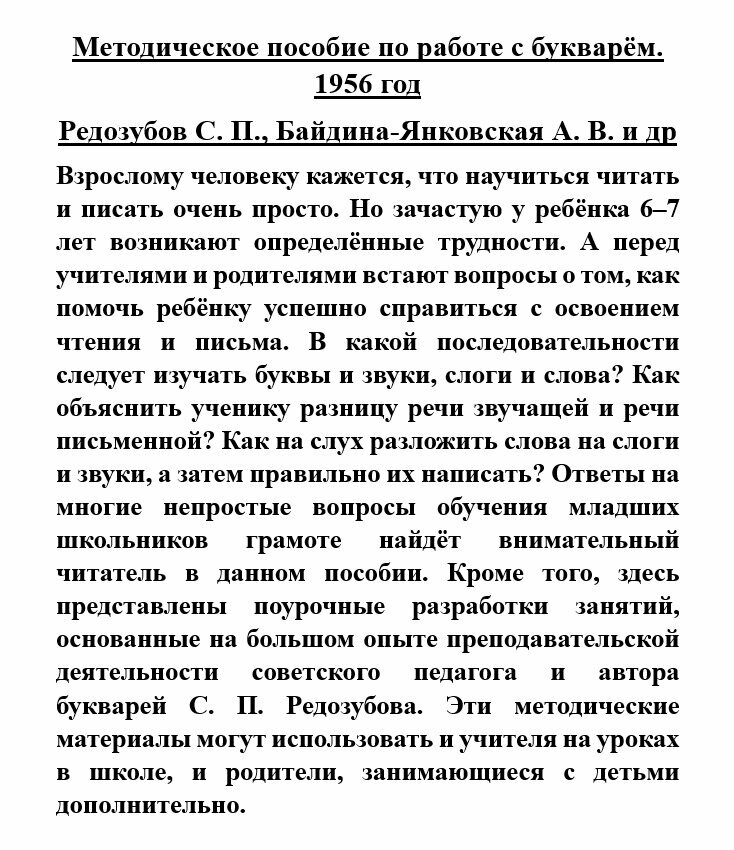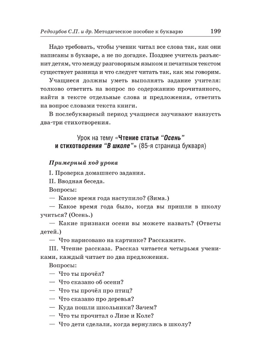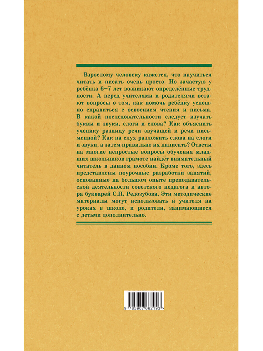 Взрослому человеку кажется, что научиться читать и писать очень просто. Но зачастую у ребёнка 6–7 лет возникают определённые трудности. А перед учителями и родителями встают вопросы о том, как помочь ребёнку успешно справиться с освоением чтения и письма. В какой последовательности следует изучать буквы и звуки, слоги и слова? Как объяснить ученику разницу речи звучащей и речи письменной? Как на слух разложить слова на слоги и звуки, а затем правильно их написать? Ответы на многие непростые вопросы обучения младших школьников грамоте найдёт внимательный читатель в данном пособии. Кроме того, здесь представлены поурочные разработки занятий, основанные на большом опыте преподавательской деятельности советского педагога и автора букварей С. П. Редозубова. Эти методические материалы могут использовать и учителя на уроках в школе, и родители, занимающиеся с детьми дополнительно.