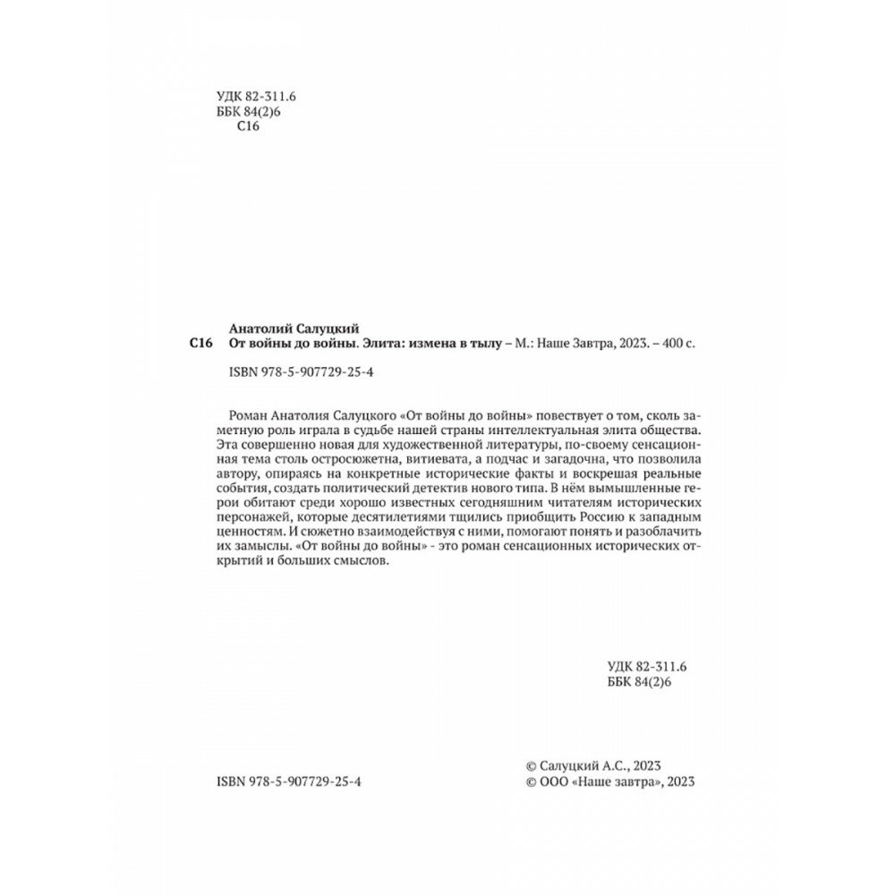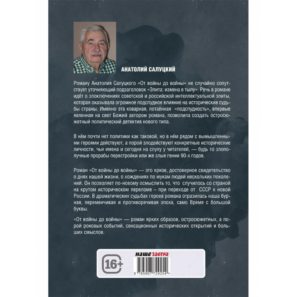 Роман Анатолия Салуцкого «От войны до войны» повествует о том, сколь заметную роль играла в судьбе нашей страны интеллектуальная элита общества. Эта совершенно новая для художественной литературы, по-своему сенсационная тема столь остросюжетна, витиевата, а подчас и загадочна, что позволила автору, опираясь на конкретные исторические факты и воскрешая реальные события, создать политический детектив нового типа. В нём вымышленные герои обитают среди хорошо известных сегодняшним читателям исторических персонажей, которые десятилетиями тщились приобщить Россию к западным ценностям. И сюжетно взаимодействуя с ними, помогают понять и разоблачить их замыслы. «От войны до войны» — это роман сенсационных исторических от крытий и больших смыслов. От войны до войны. Элита: измена в тылу. Салуцкий А. С.