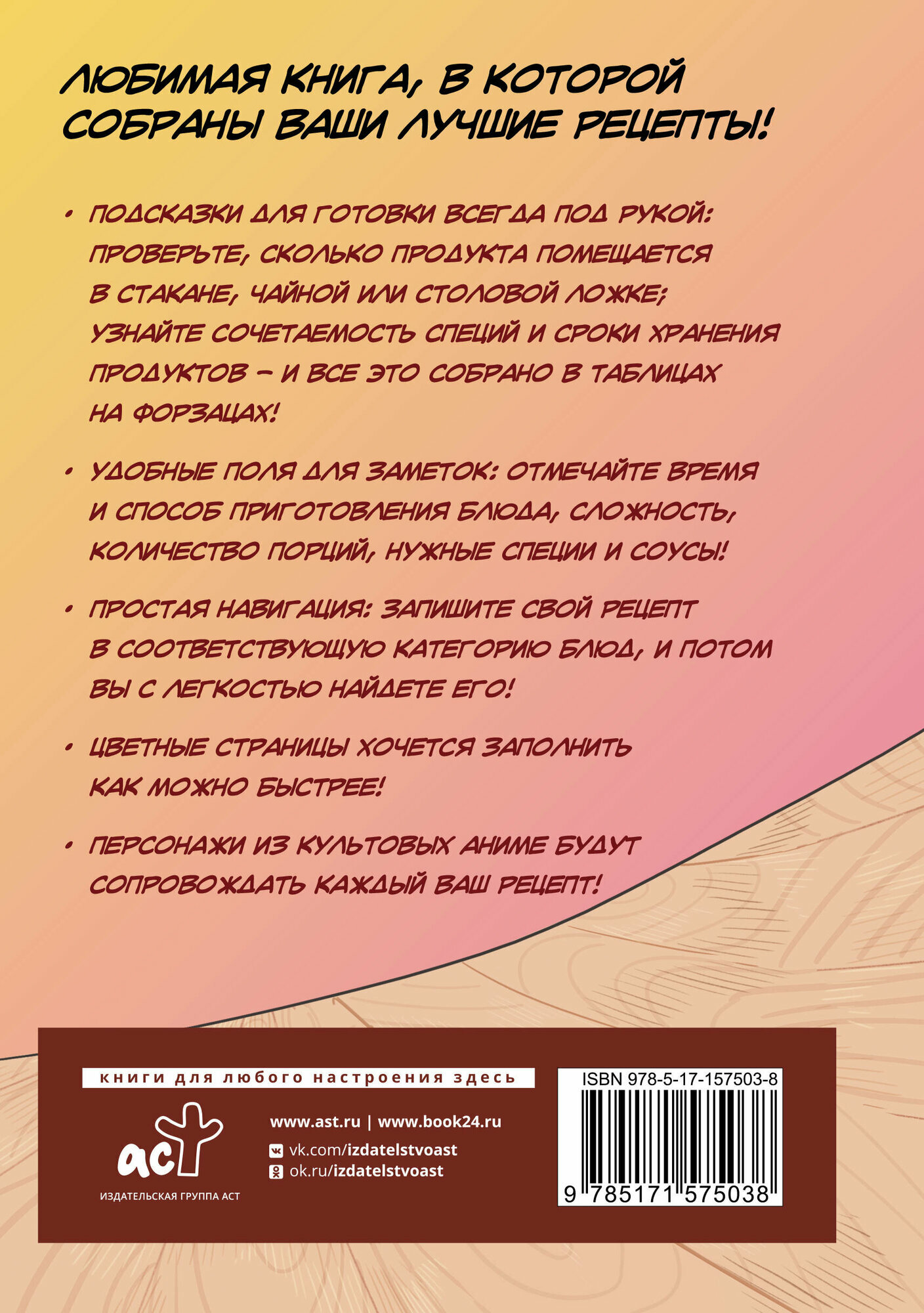 узнайте сочетаемость специй и сроки хранения продуктов – и все это собрано в таблицах на форзацах!○ Удобные поля для заметок: отмечайте время и способ приготовления блюда, сложность, количество порций, нужные специи и соусы!○ Простая навигация: запишите свой рецепт в соответствующую категорию блюд, и потом вы с легкостью найдете его!○ Цветные страницы хочется заполнить как можно быстрее!○ Персонажи из культовых аниме будут сопровождать каждый ваш рецепт!
