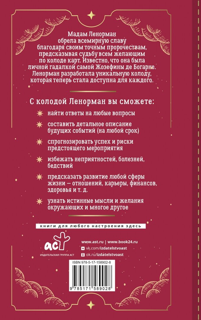 Мария Ленорман обрела всемирную славу благодаря своим точным пророчествам, предсказывая судьбу всем желающим по колоде карт. Известно, что она была личной гадалкой самой Жозефины де Богарне. Ленорман разработала уникальную колоду карт, которая теперь стала доступна для каждого.