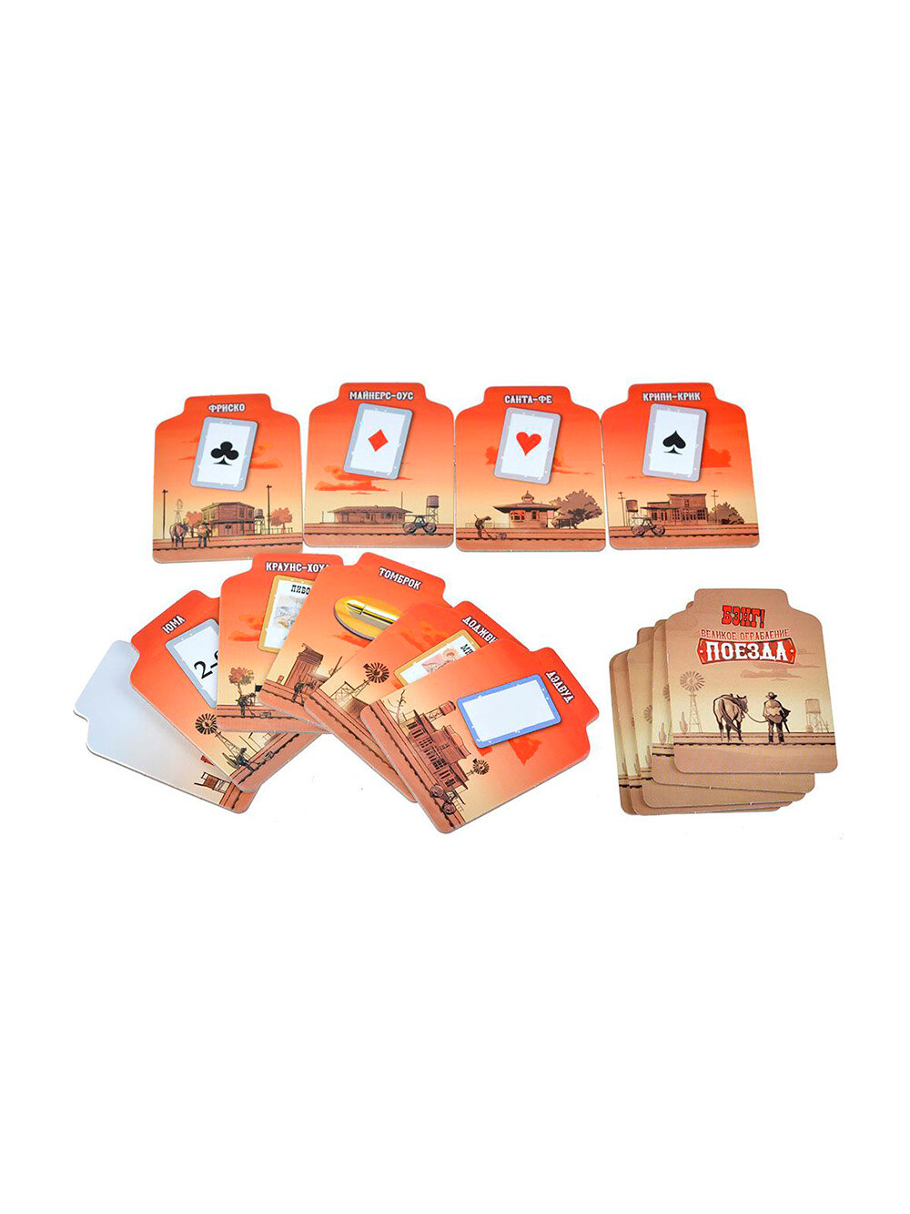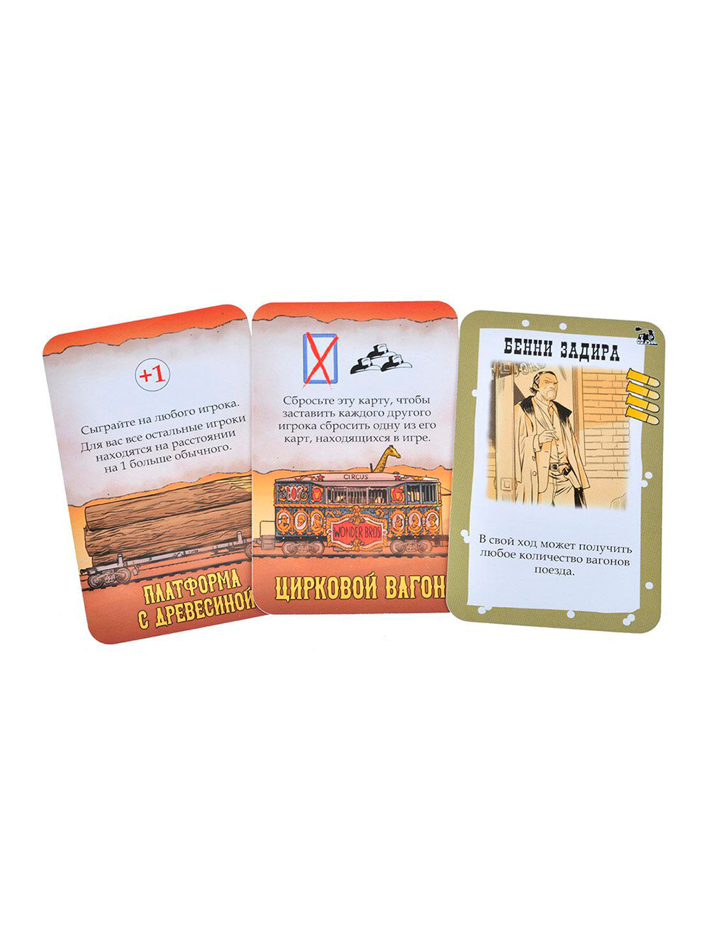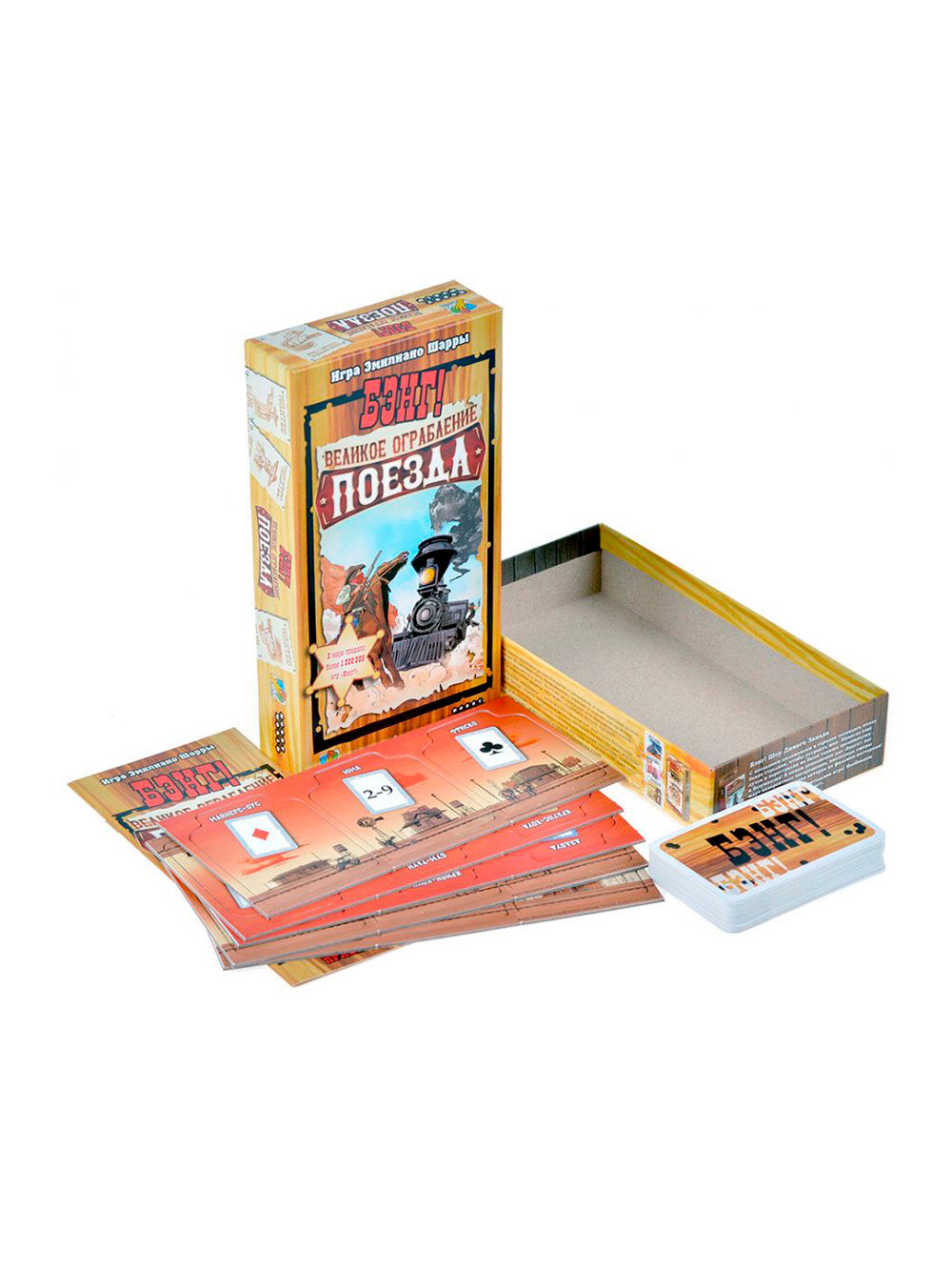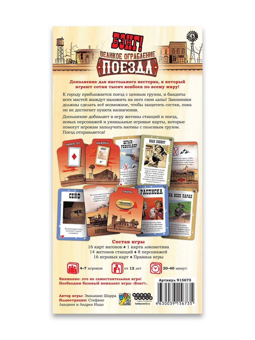Быстрее и сильнееНовое дополнение для настольной игры "Бэнг"! Если вы уже соскучились по атмосфере Дикого, Дикого Запада, то специально для вас – новые антуражные особенности. Уникальные персонажи, жетон станции и поезда и игровые карты, которые и позволят заполучить ценный груз. Теперь поезд – тоже важная цель, которая позволит накладывать различные ограничения на других игроков, а станции, как правило, вынуждают скидывать вас карты. Да, железнодорожное дело в то время – потная и неблагодарная работёнка! Но в салун мы пойдём позже.