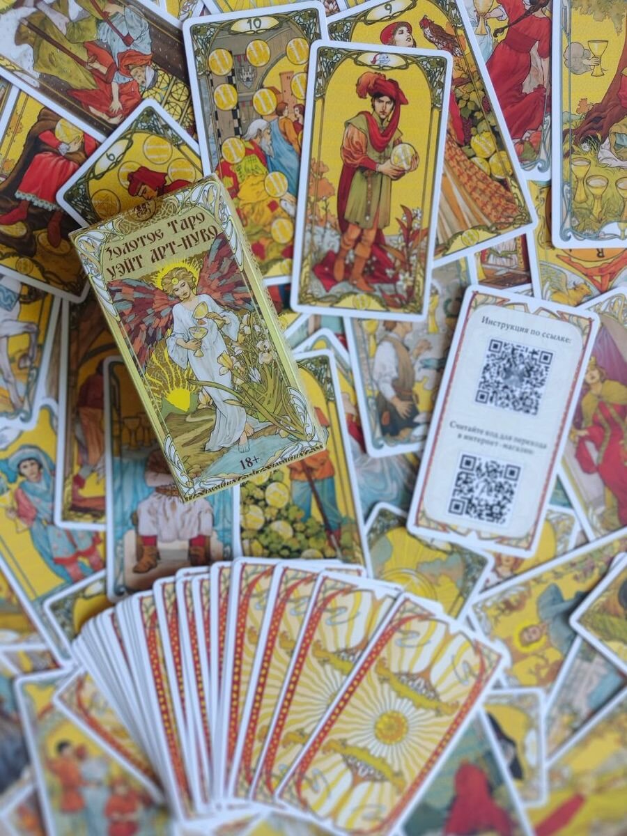 Золотое Таро Уэйт Арт-Нуво станет отличным подарком для любителей гаданий и предсказаний, а также для коллекционеров художественных колод.