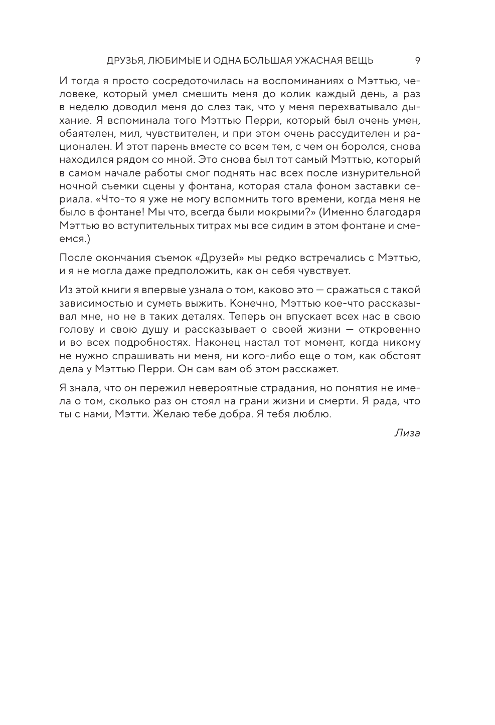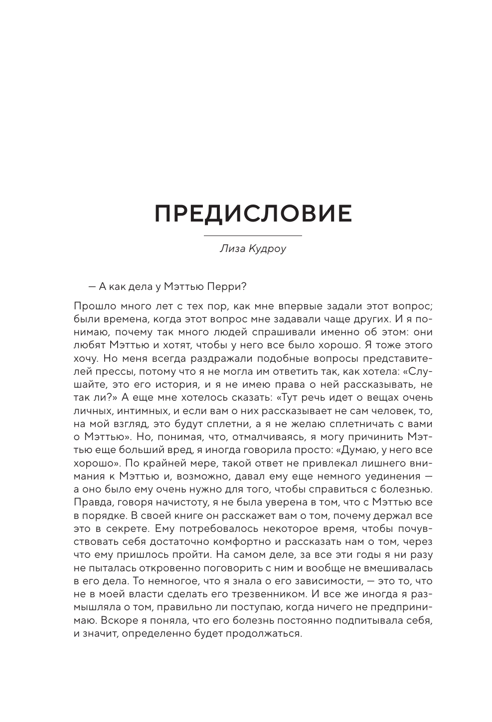 Ух, тут много сказано о грустных сторонах книги. А мне понравились воспоминания Мэттью о позитивных людях, которые встретились ему на пути. Например, его друзьях по сериалу, Брюсе Уиллисе, близких ему женщинах (которые сделали для него больше, чем он для них), о кураторах и помощниках, кто бесконечно вытаскивал его из пропасти. Обожаю сериал «Друзья», но даже не знала, какую борьбу он вел. Теперь все выглядит немного по-другому.
