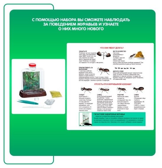 Французские опыты Науки с Буки, Город муравьёв. Этот набор предназначен для создания дома настоящего города муравьев. Ребенок сможет наглядно увидеть, каким сложным миром является самый обычный муравейник. С помощью набора ребенок узнает, как муравьи общаются между собой, как они ведут хозяйство, присматривают за маленькими муравьями. Оказывается, в муравьиной колонии есть четкое разграничение обязанностей! Ребенок узнает, каково это – ухаживать за живыми созданиями, и сможет наблюдать кусочек дикой природы у себя дома! В состав набора входят красочная и подробная инструкция, бутылка, отвинчивающаяся крышка, два сетчатых вкладыша, форма-стабилизатор основания, пипетка, пинцет, тарелочка для кормления, ватные шарики, мешочек с желтым песком, наклейка на заднюю стенку.