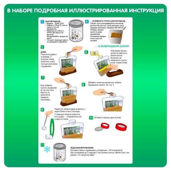 | Комплектация | бутылка, отвинчивающаяся крышка, два сетчатых вкладыша, форма-стабилизатор основания, пипетка, пинцет, тарелочка для кормления, ватные шарики, мешочек с желтым песком, наклейка на заднюю стенку, инструкция. |