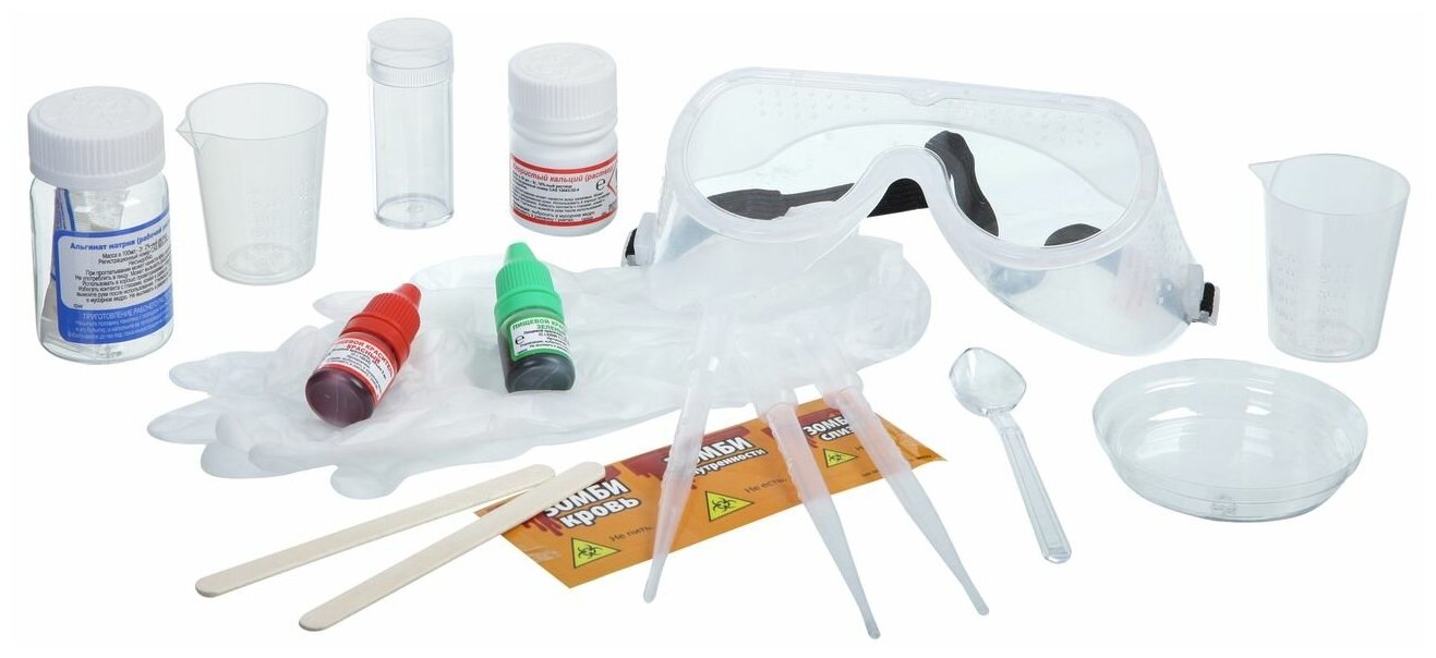| Состав набора | иллюстрированная инструкция - 1 шт; пакетик альгината - 1 шт; хлорид кальция - 1 шт; бутылка - 1 шт; краситель - 2 шт; пипетка - 3 шт; палочка для размешивания - 2 шт; тарелка - 1 шт; измерительный стакан - 2 шт; пакетик - 2 шт; трубочки - 1 шт; маленькая ложка - 1 шт; защитные очки - 1 шт; перчатки - 1 шт; наклейки - 1 шт |