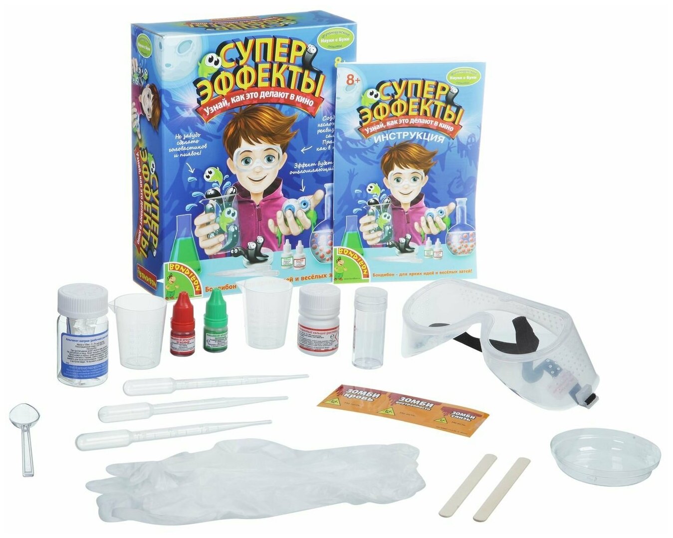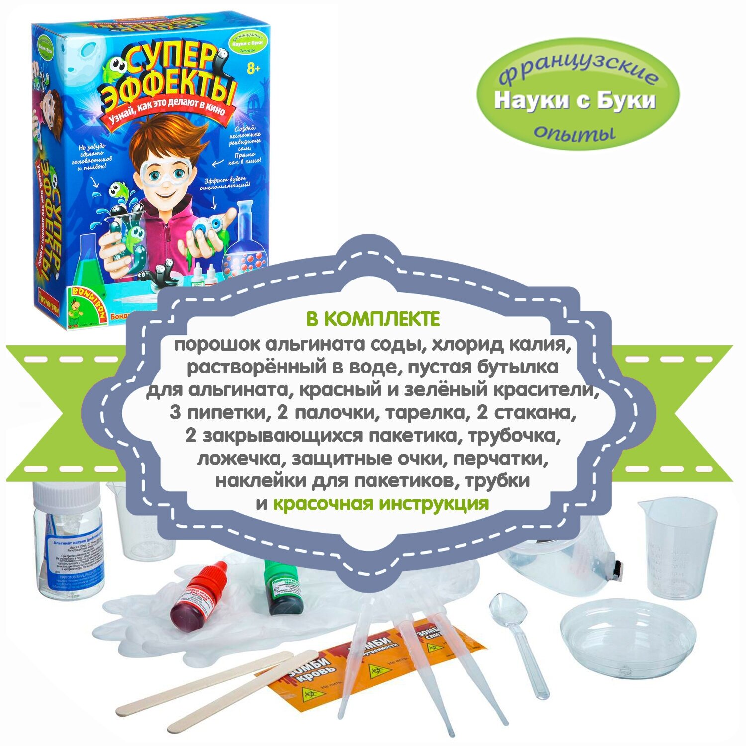 Французские опыты Науки с Буки, Суперэффекты. Этот набор для любителей страшилок и ужастиков! Несколько забавных полимерно-гелиевых опытов пояснят, как делают различные суперэффекты в кино.