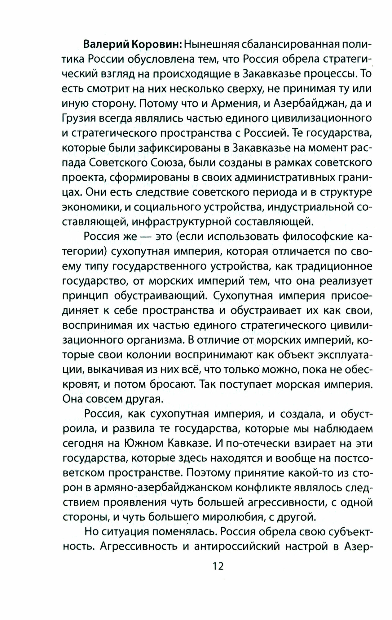 В данной книге – подборка авторских интервью российского политика, политолога и общественного деятеля Валерия Коровина, посвящённых войне и миру в Закавказье, а также взаимоотношениям основных субъектов кавказской геополитики: России, Армении, Азербайджана, Ирана и Турции. Главной темой бесед является ситуация вокруг Карабаха – предпосылки к возникающей напряжённости и игры Запада вокруг карабахской проблемы с целью дестабилизации и перекройки границ в своих интересах. По мнению автора, подход Запада остаётся неизменным – это крайнее высокомерие и пренебрежение интересами незападных государств, народов, культур и цивилизаций.