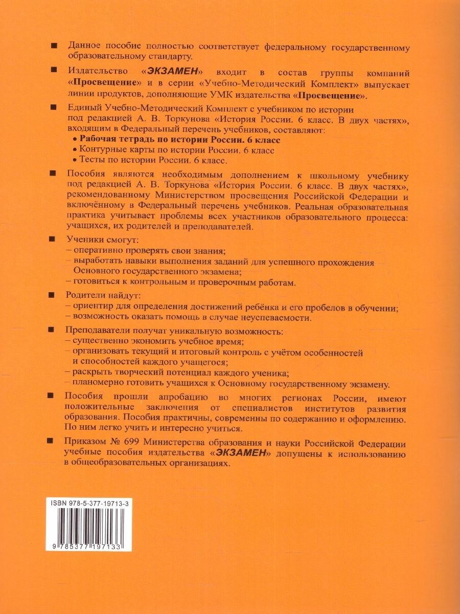 Рабочая тетрадь соответствует содержанию и структуре учебника под ред. А. В. Торкунова по истории России для 6 класса общеобразовательных организаций (издательство "Просвещение"). В неё включены разнообразные по форме и уровню сложности задания, выполняя которые учащиеся повторяют и углубляют полученные на уроке знания, закрепляют и совершенствуют необходимые умения и навыки. Контурные карты и задания к ним помогут учащимся сформировать навыки работы с историческим атласом и картами учебника. С тетрадью можно работать как на уроке, так и дома.