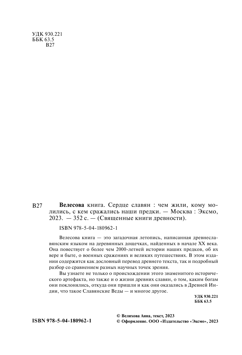 Велесова книга: сердце славян. Чем жили кому мол. (Анна Велихова); Эксмо, 2025