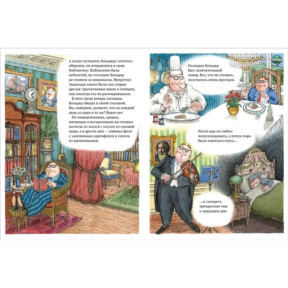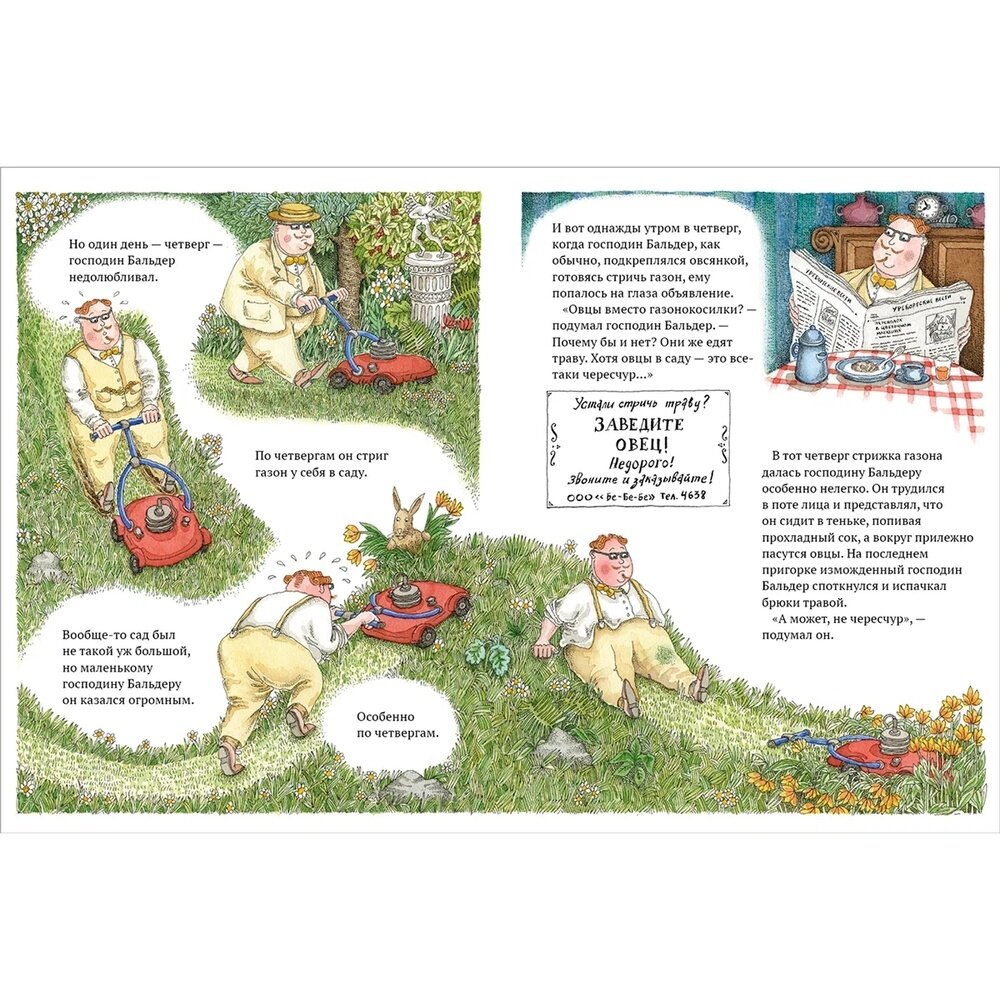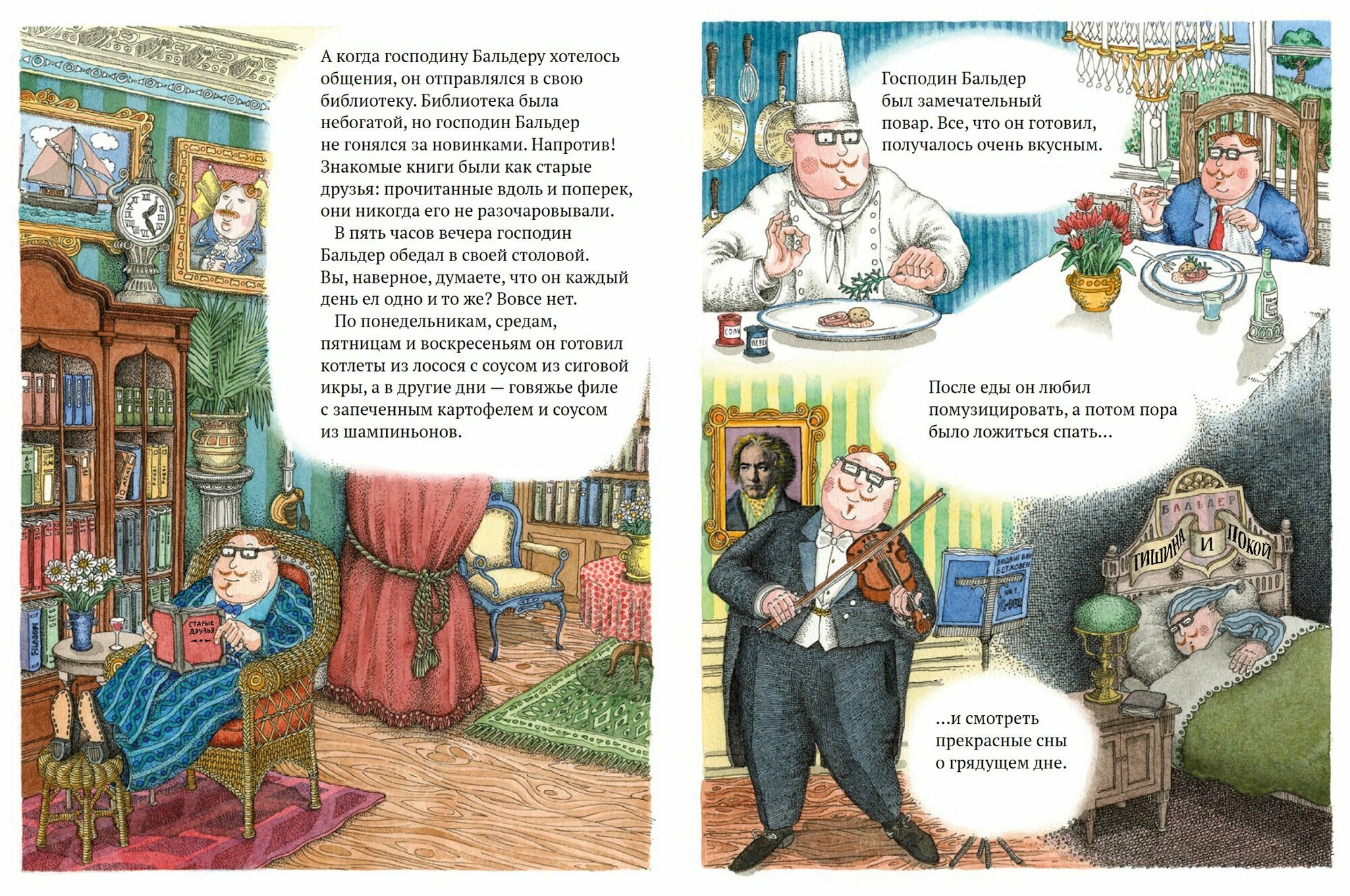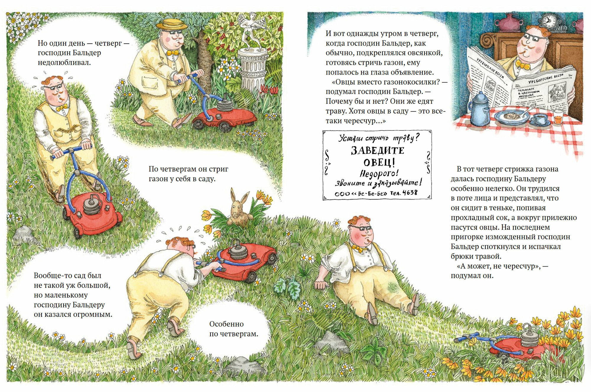 Господин Бальдер - отменный повар, виртуозный музыкант и любитель почитать в одиночестве. По понедельникам, средам, пятницам и воскресеньям он готовил котлеты из лосося с соусом из сиговой икры, а в другие дни - говяжье филе с запеченным картофелем и соусом из шампиньонов. Но один день - четверг - господин Бальдер недолюбливал, потому по четвергам он стриг газон. Но вот однажды, когда господин Бальдер, как обычно, подкреплялся овсянкой, ему на глаза попалось странное объявление: