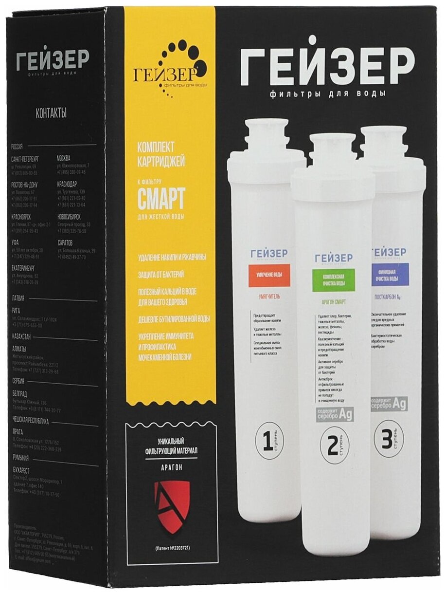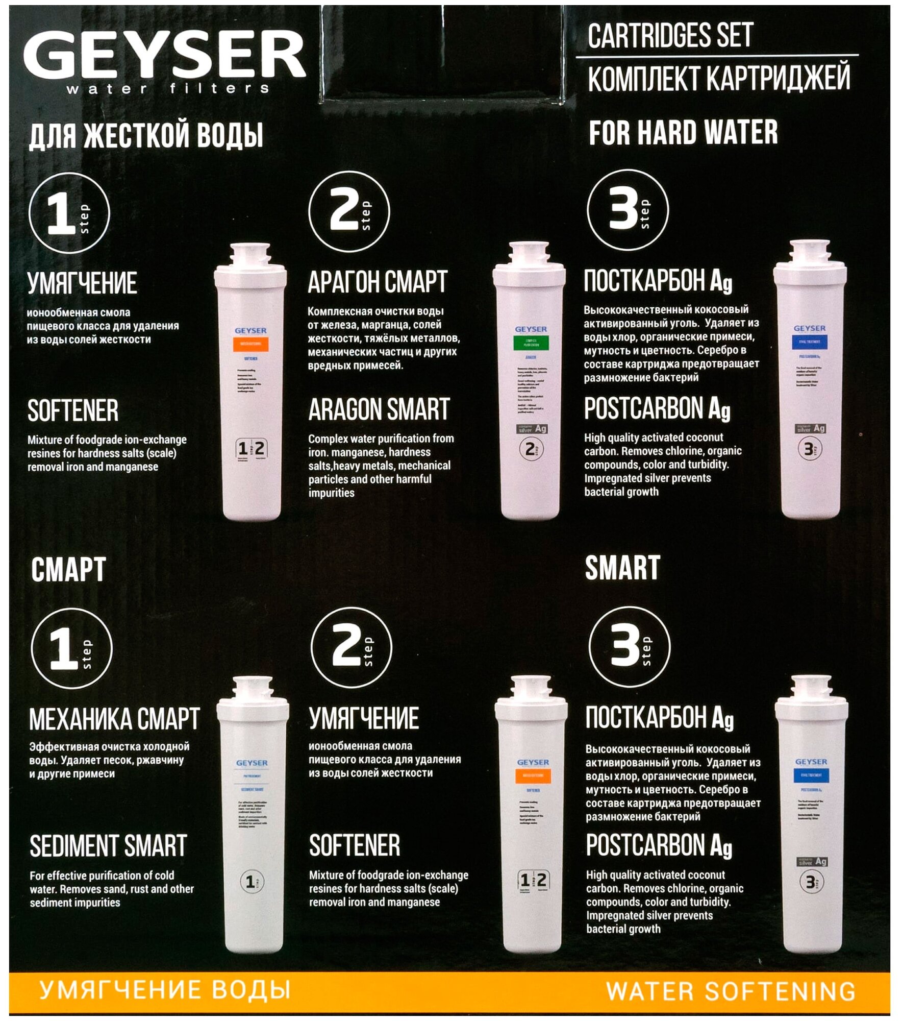 Трехступенчатый фильтр Гейзер "Смарт" для жесткой воды Благодаря простой и легкой системе замены картриджей процедура замены не займет много времени. Вода после фильтра насыщается полезным кальцием. Уникальный фильтрующие материал Арагон задерживает бактерии, не дает им проникнуть в очищенную воду и блокирует их размножение! Также фильтр имеет увеличенный ресурс по удалению накипи. Способы очистки: Умягчение - ионообменная смола пищевого класса для удаления из воды солей жесткости и железа.