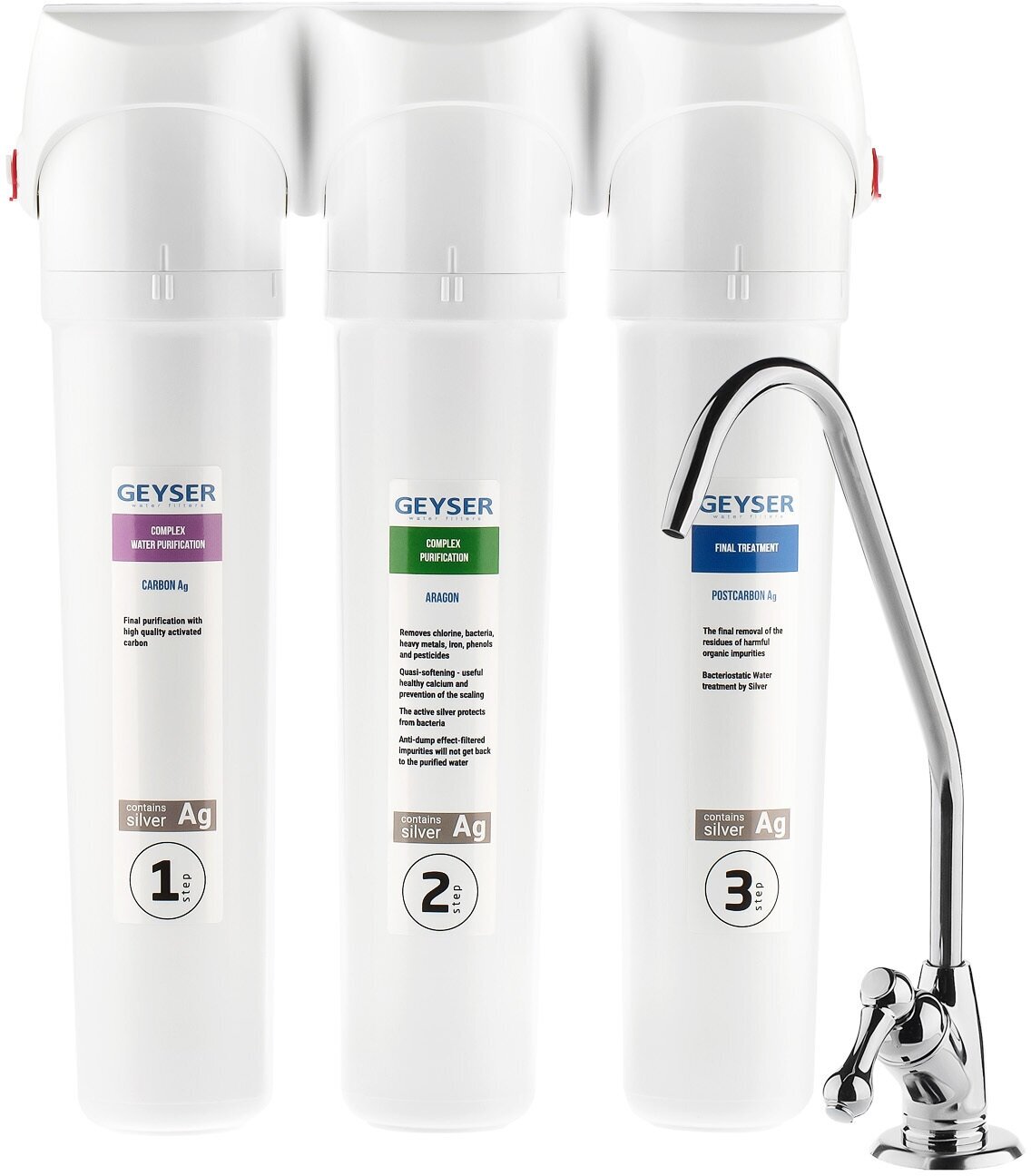 Комплект Гейзер для состоит из 3 картриджей, обеспечивающих не только качественную очистку воды от ржавчины, хлора, различных примесей и бактерий, но и насыщающих ее кальцием. Изделия отличаются легкостью установки.