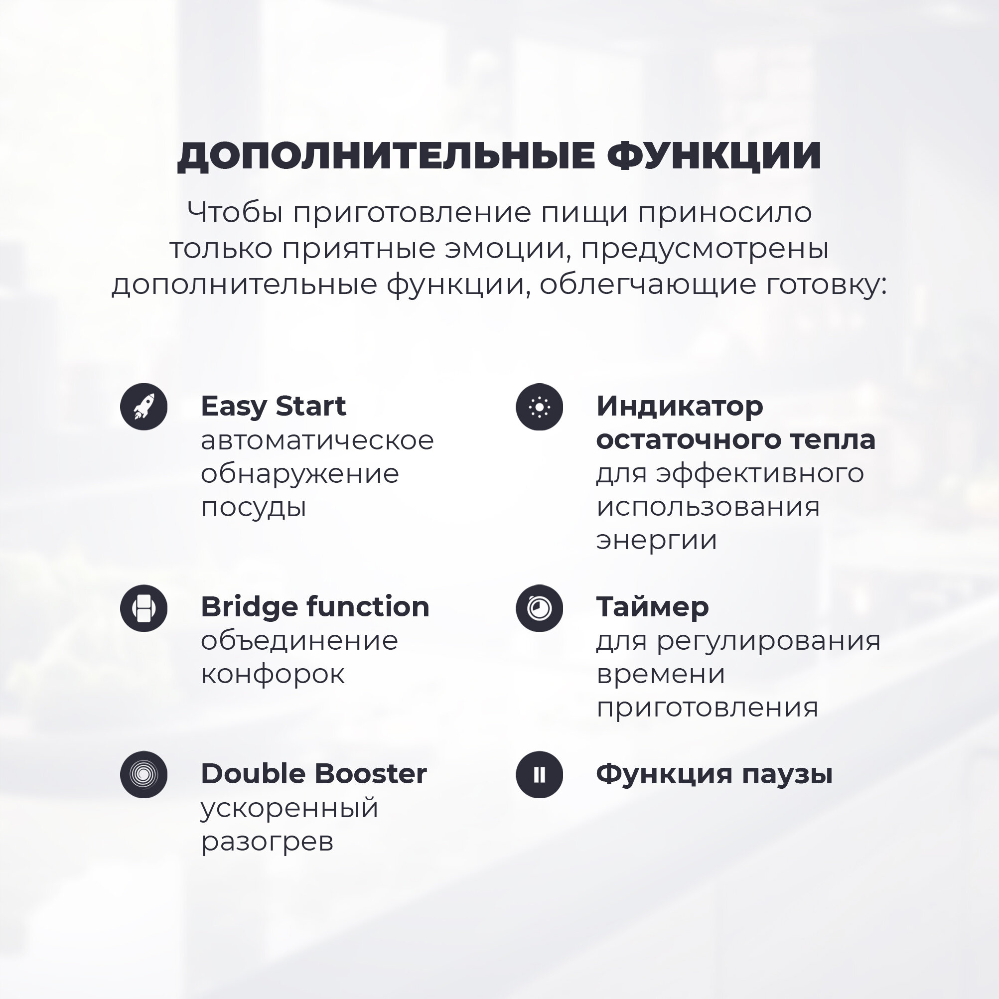 | Функции | Booster, распознавание наличия посуды, таймер |