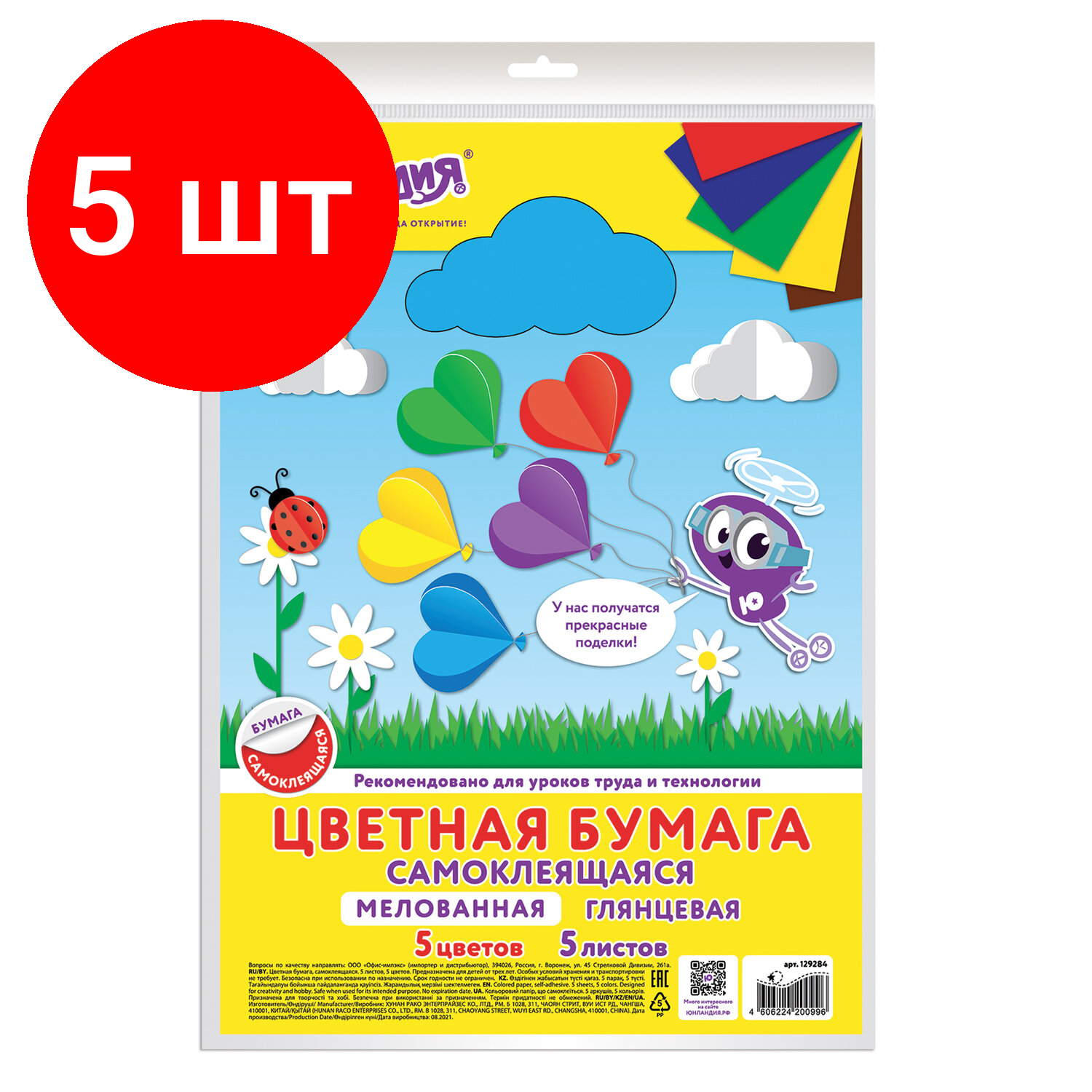 Бумага цветная ЮНЛАНДИЯ самоклеящаяся А4 5 л