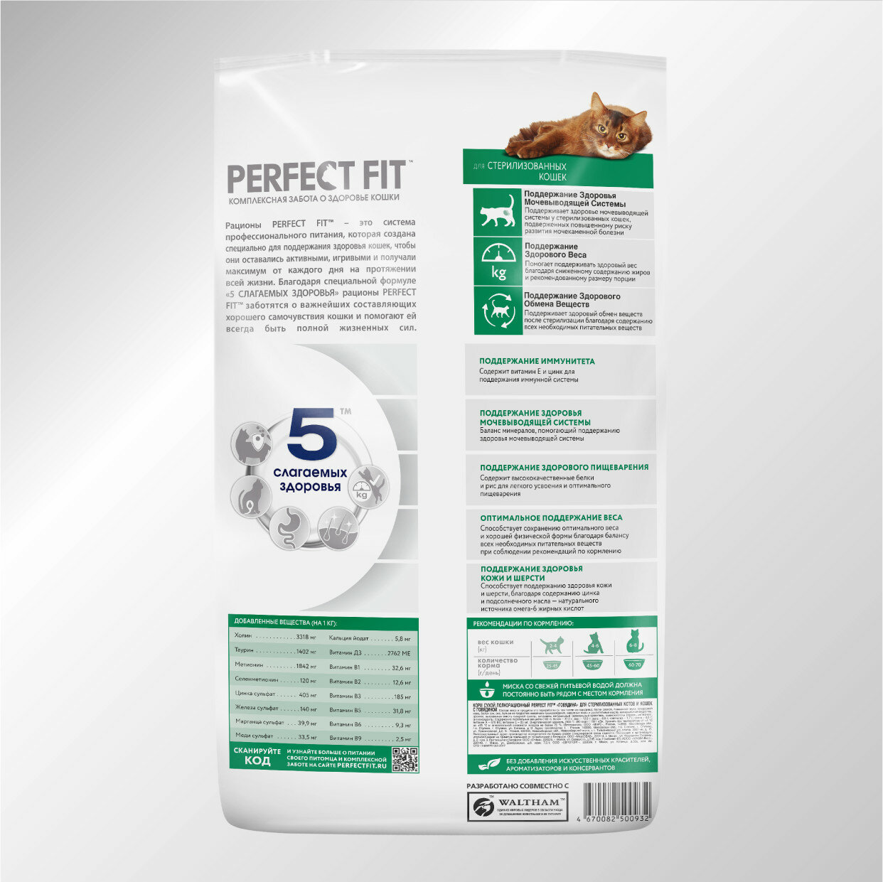 В рационе PERFECT FIT™ для стерилизованных кошек мы учли потребности организма кошки, прошедшей стерилизацию. Здоровье мочевыводящей системы. Поддерживает здоровье мочевыводящей системы у стерилизованных кошек, подверженных повышенному риску развития мочекаменной болезни. Поддержание здорового веса. Помогает поддерживать здоровый вес благодаря сниженному содержанию жиров и рекомендованному оптимальному размеру порции. Здоровый обмен веществ. Поддерживает здоровый обмен веществ после стерилизации благодаря содержанию всех необходимых питательных веществ. Рекомендации по кормлению (вес животного, кг – грамм корма в сутки): 2-4 кг - 25-45 г; 4-6 кг - 45-60 г; 6-8 кг - 60-70 г; 8-10 кг - 70-85 г . Миска со свежей питьевой водой должна постоянно быть рядом с местом кормления. Хранить при температуре от +4 С до +35 С и относительной влажности воздуха не более 75 %.