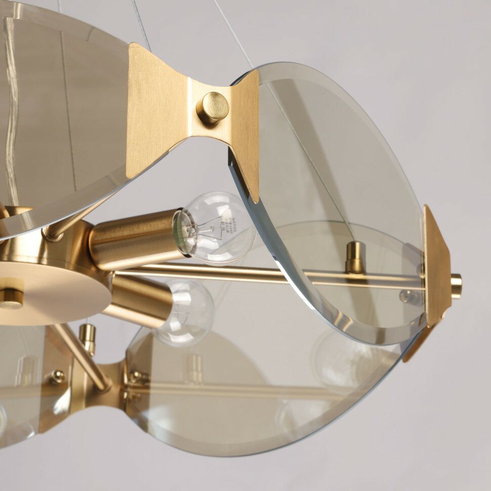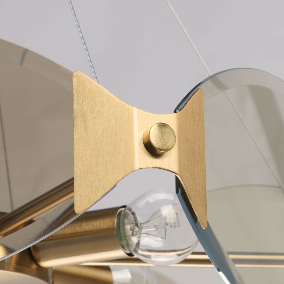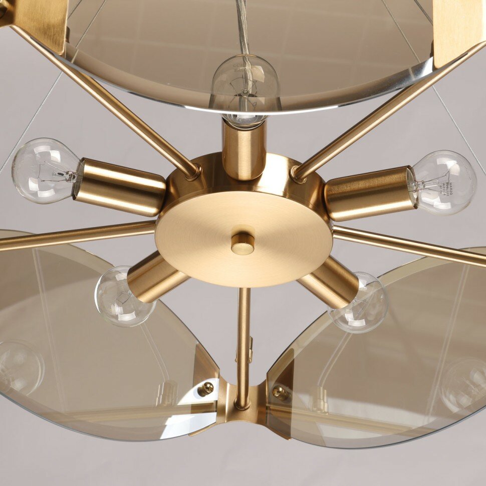 Металлическое основание подвесной люстры гальванизировано в цвет латуни. Люстра декорирована стеклянными элементами, гальванизированными в цвет шампань.
