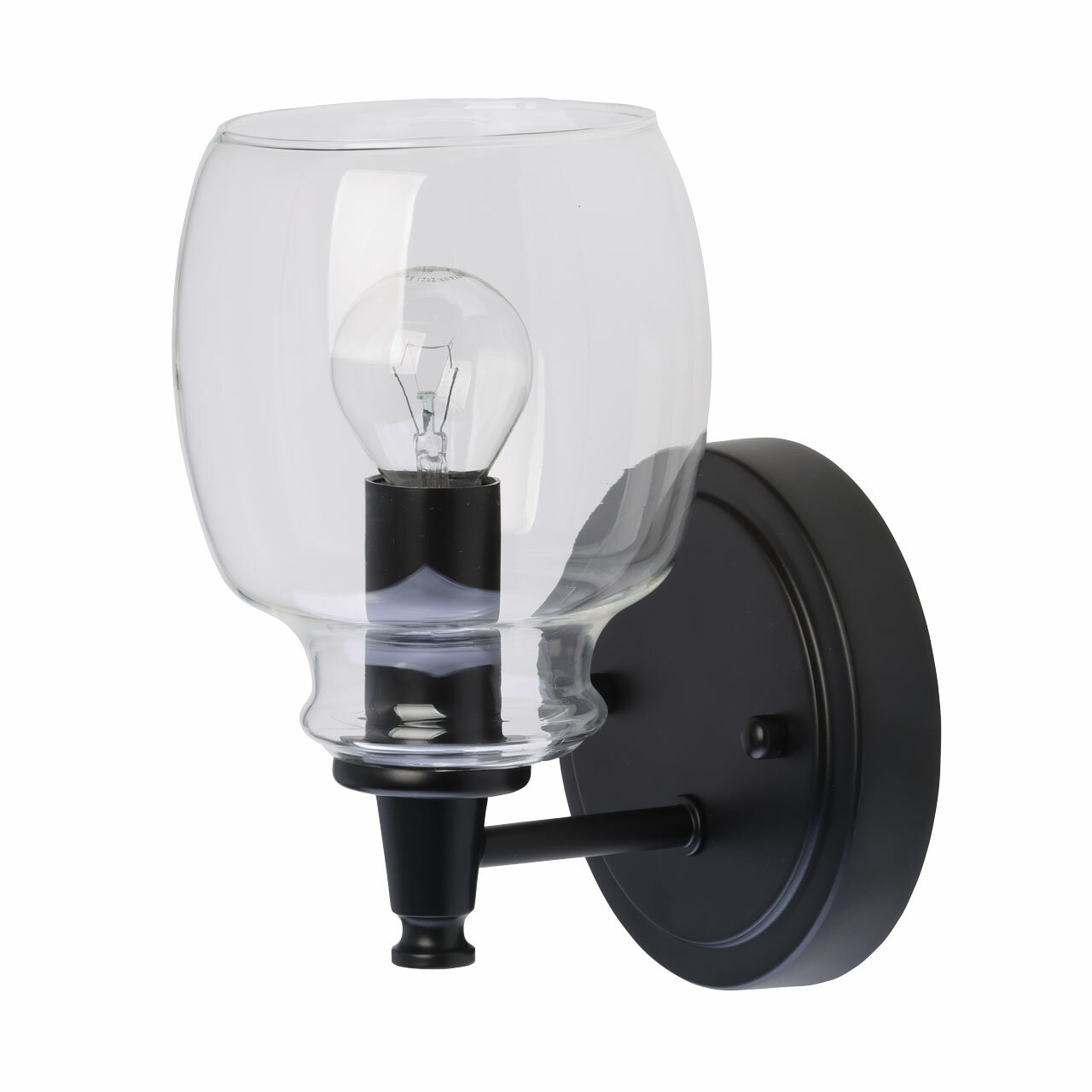 Металлическое основание настенного бра окрашено в черный цвет. Источник света закрыт стеклянным плафоном.