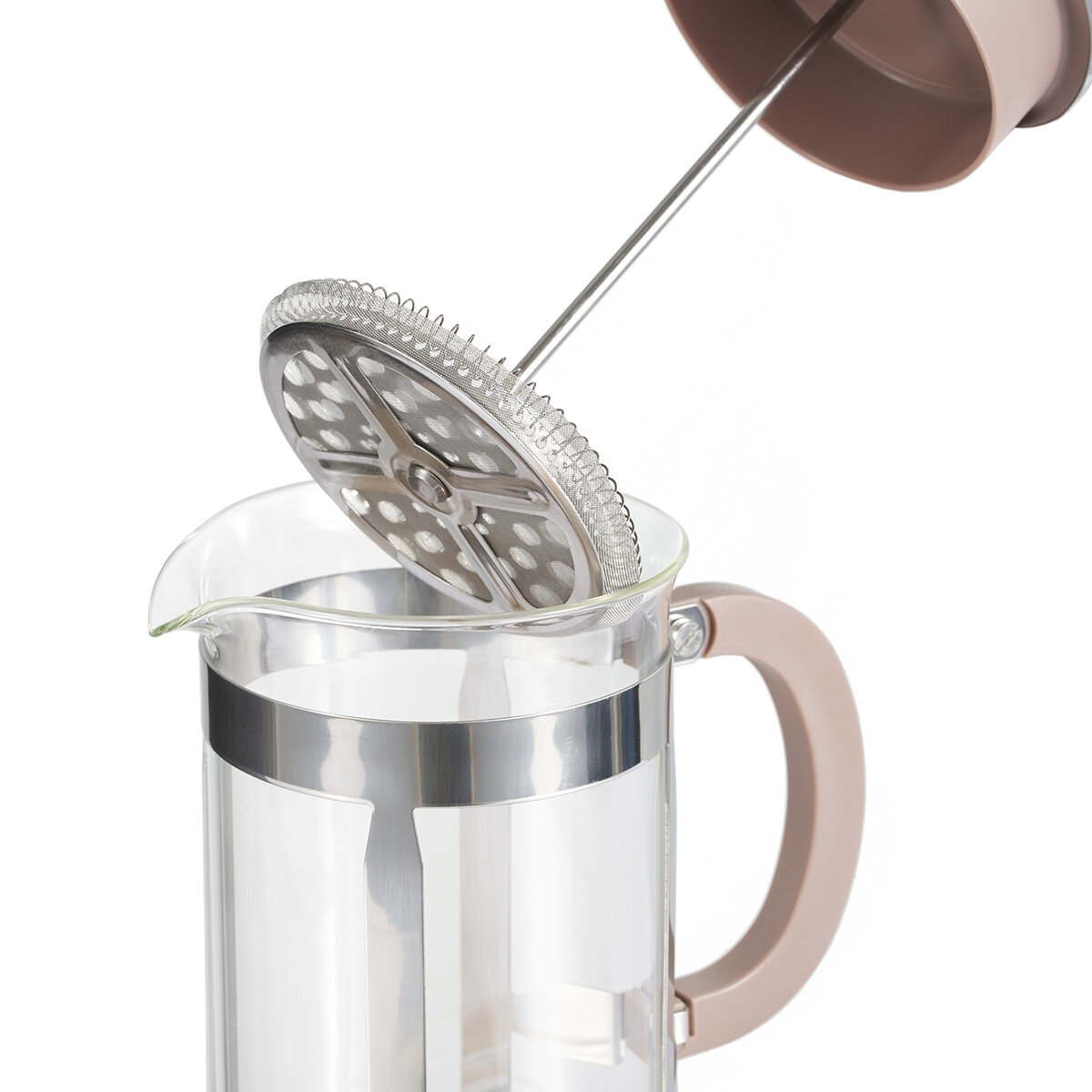 Для приготовления напитка насыпьте в колбу молотый кофе, залейте горячей водой, опустите пресс-фильтр и оставьте настаиваться. Молотый кофе пресс-фильтр плотно прижмет к дну кофейника, а уплотнительное кольцо не даст ему попасть в напиток.