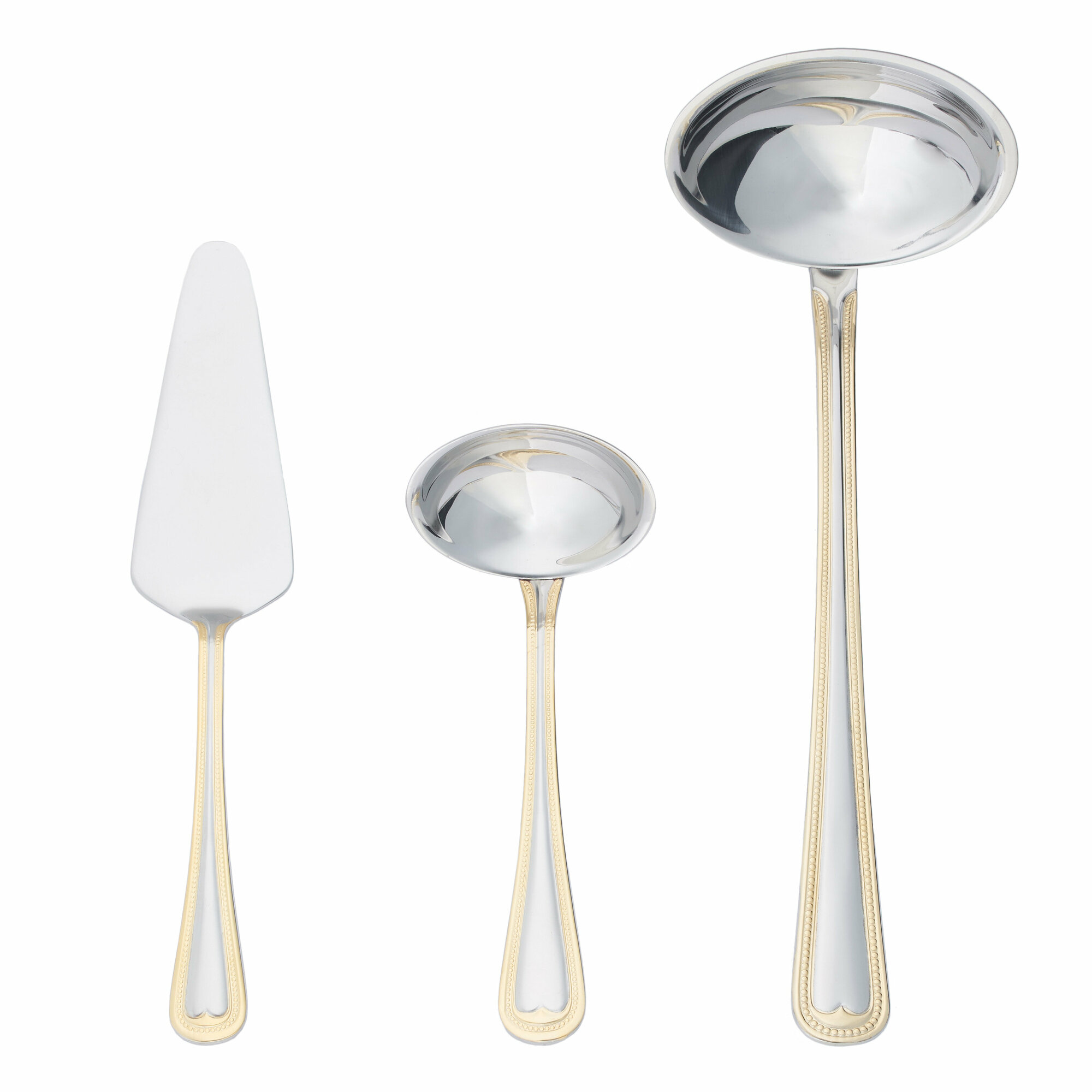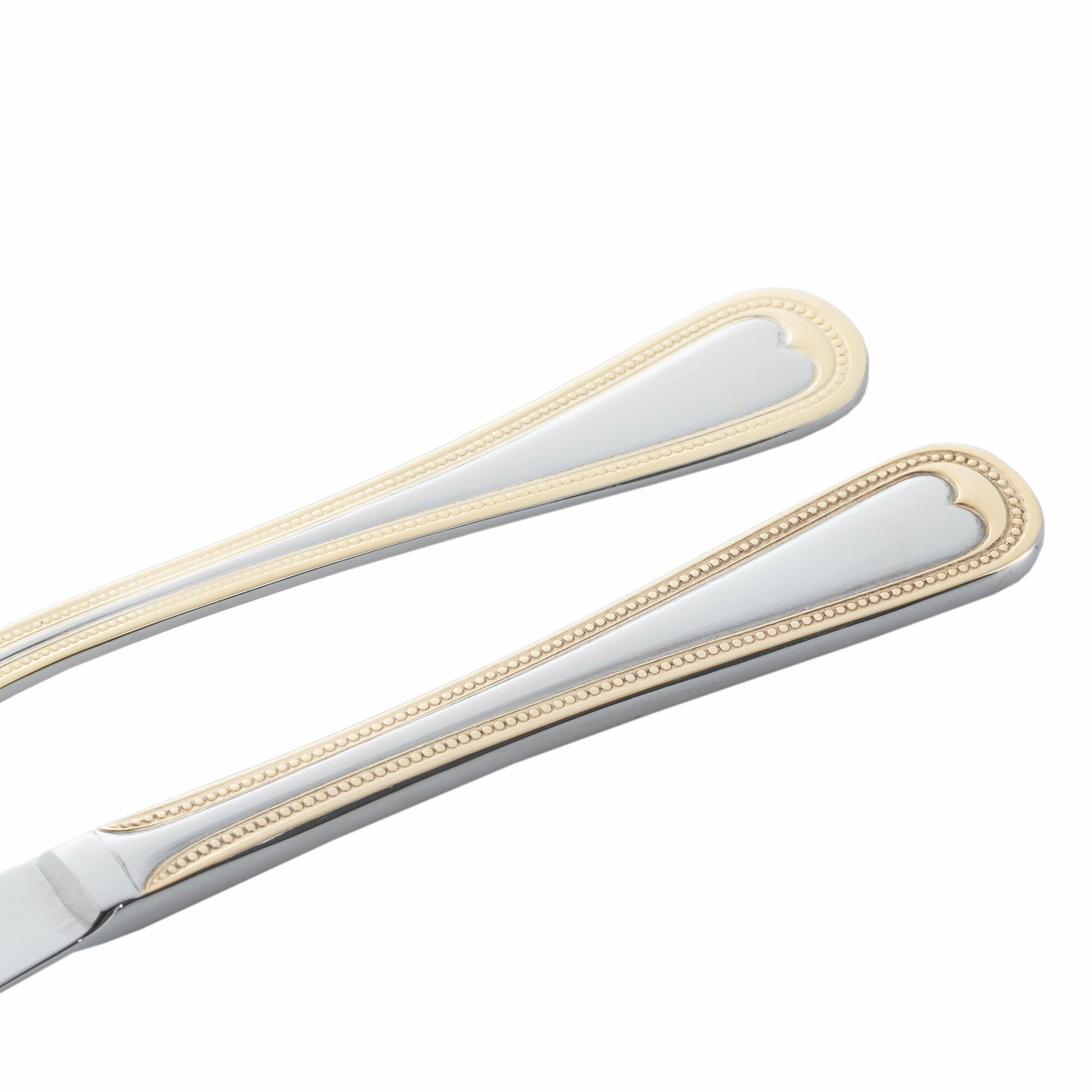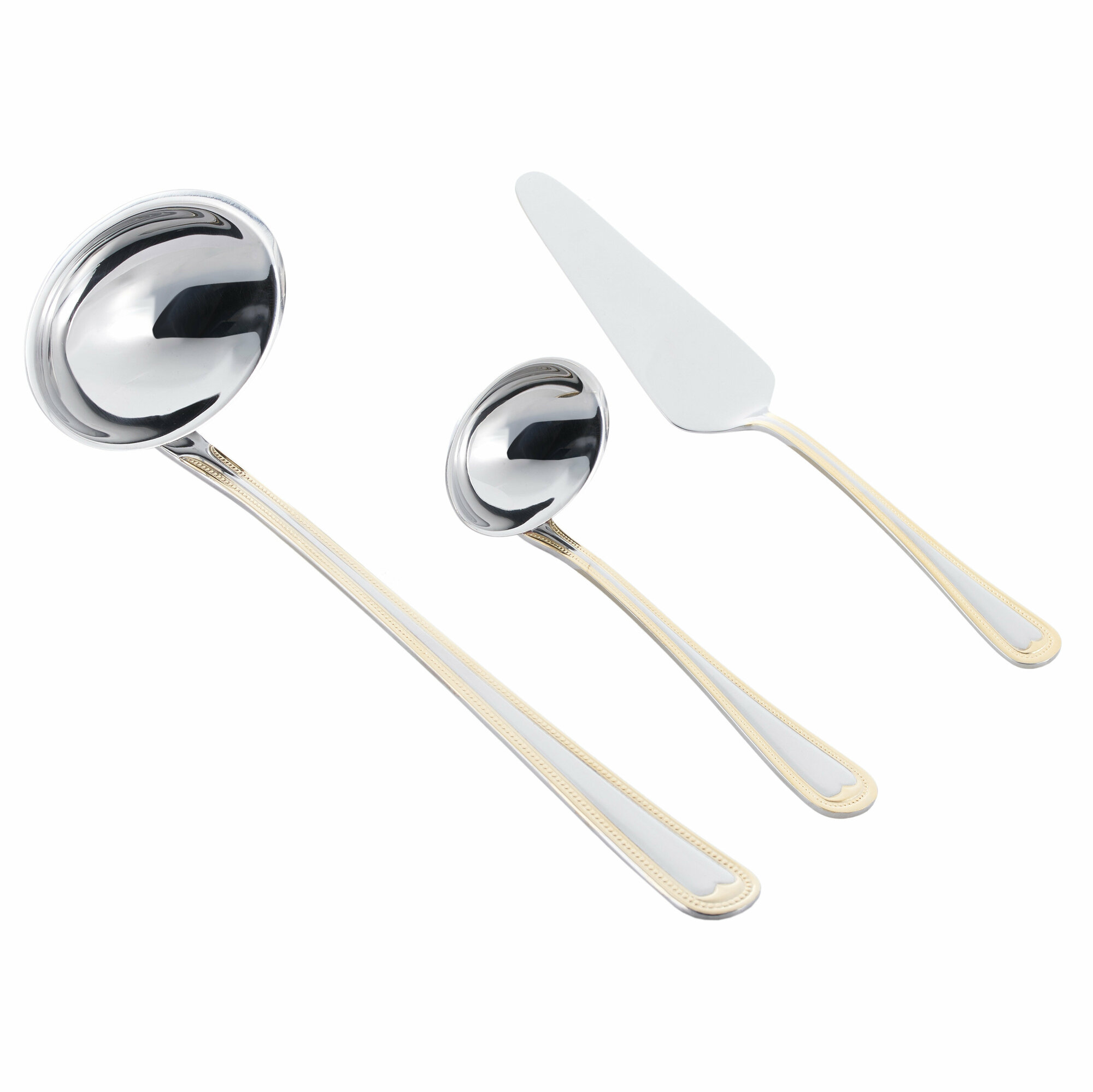 Блестящая поверхность изделий великолепно дополнит повседневную и праздничную сервировку, торжественный обед или ужин. Рукоятка имеет рельефный декор с золотистой окантовкой по краю, который не только украшает изделия, они удобно располагаются в руке.
