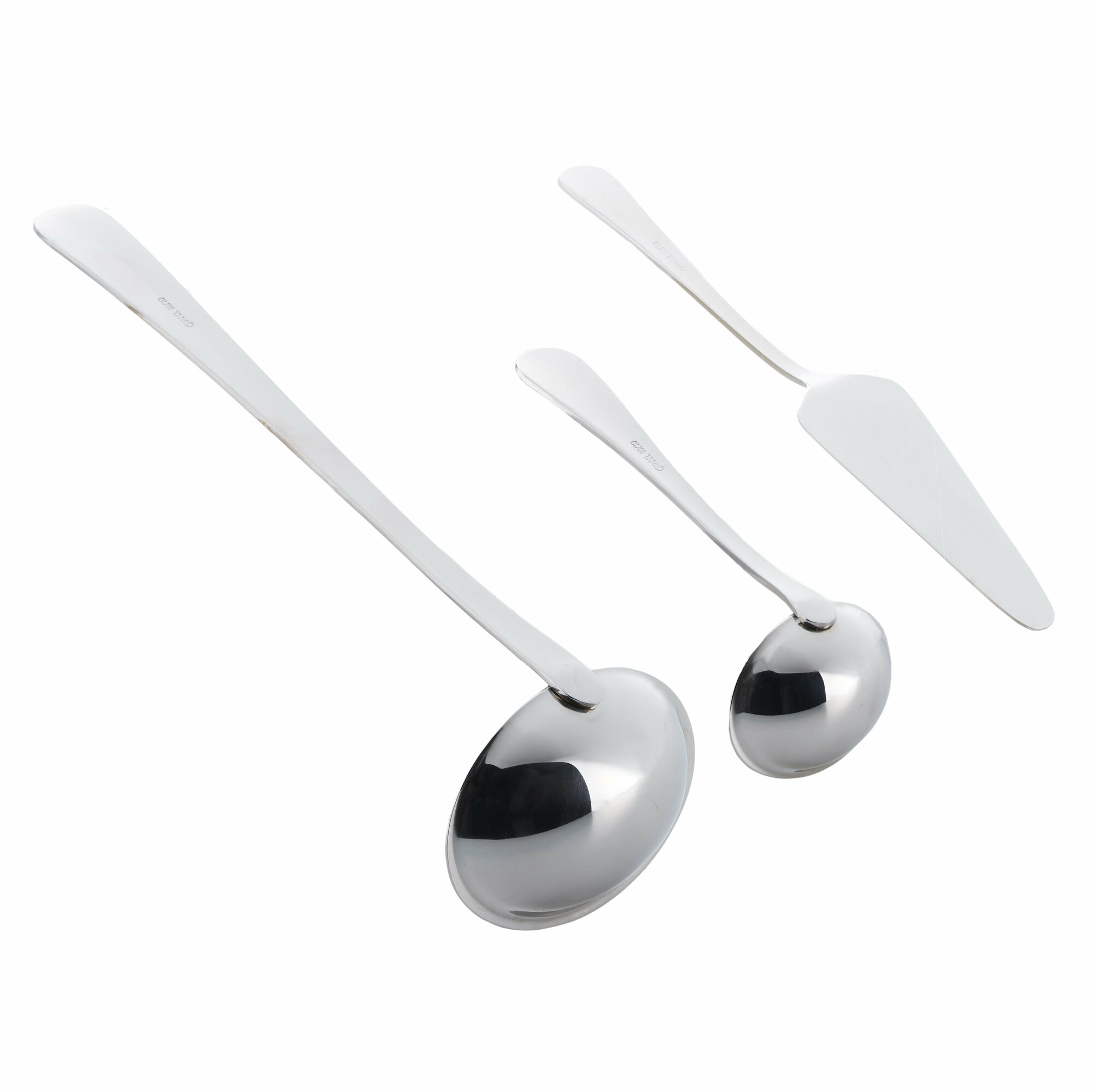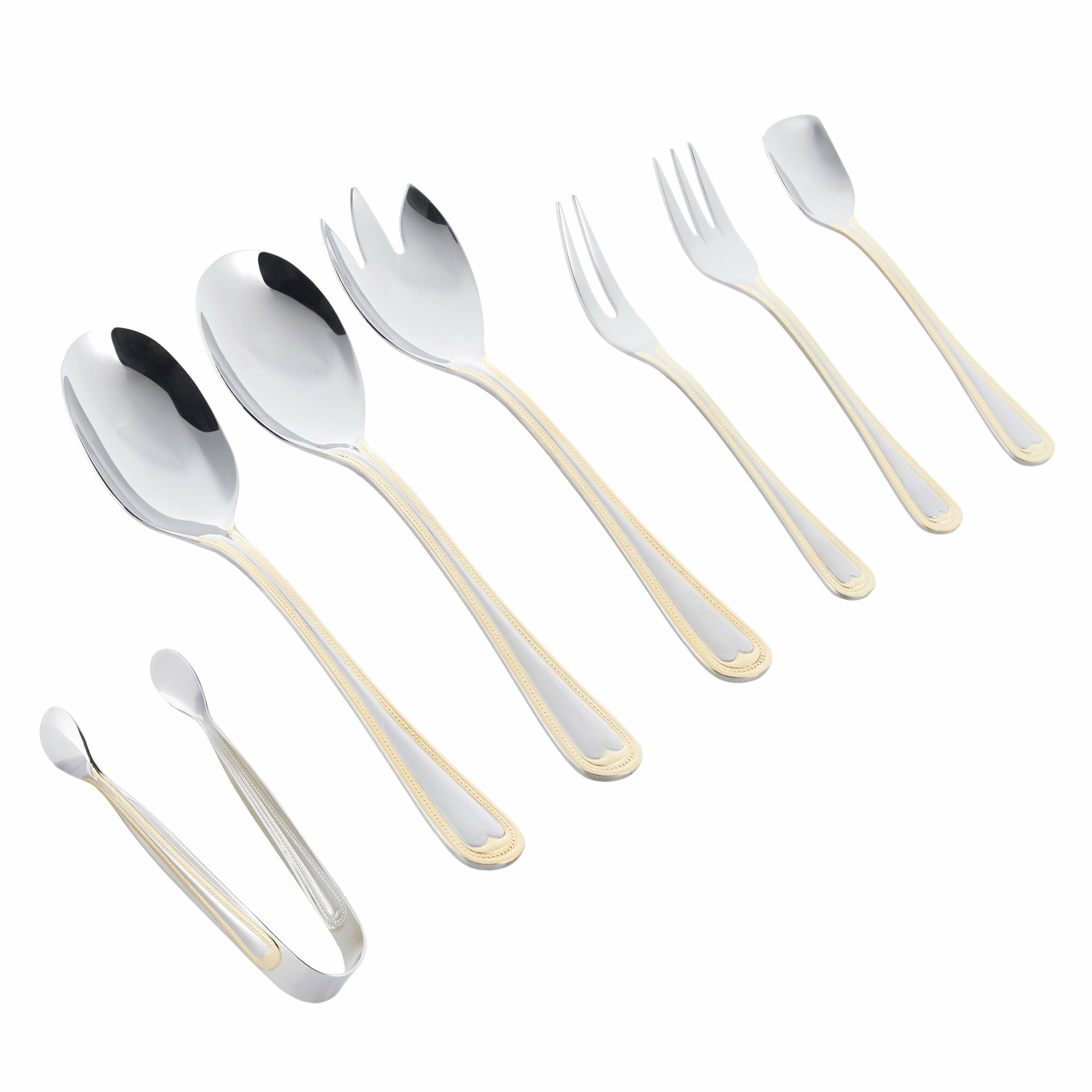 | Состав набора | 12 ножей столовых, 12 вилок столовых,12 ложек столовых, 12 ложек чайных, 12 вилок десертных, 2 мясные вилки, 2 ложки салатные, 2 ложки сервировочные, вилка салатная, ложка для сахара, щипцы для сахара, лопатка для торта, половник, соусник |