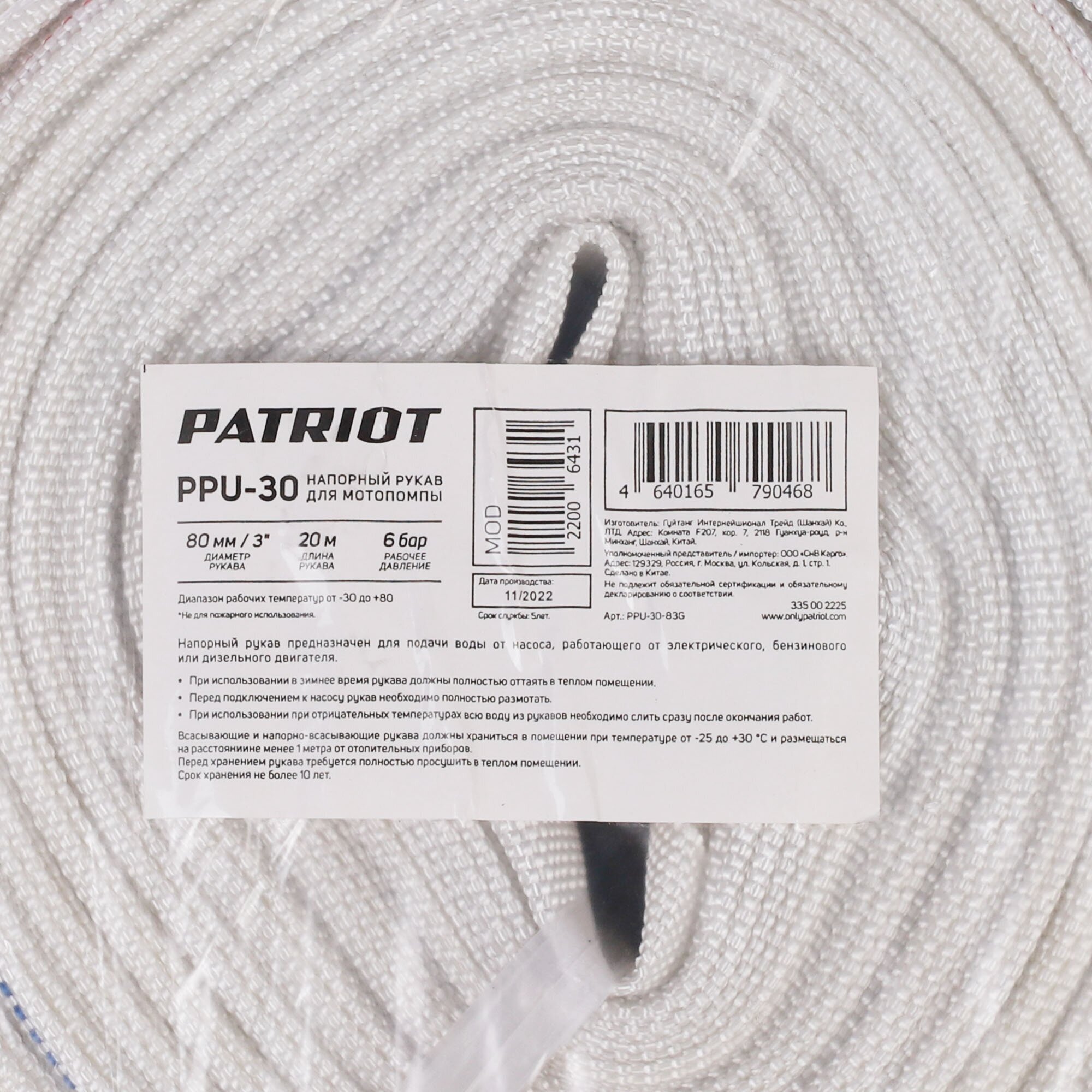 | Комплектация | Рукав напорный без соединительных головок, бухта 20 метров. |