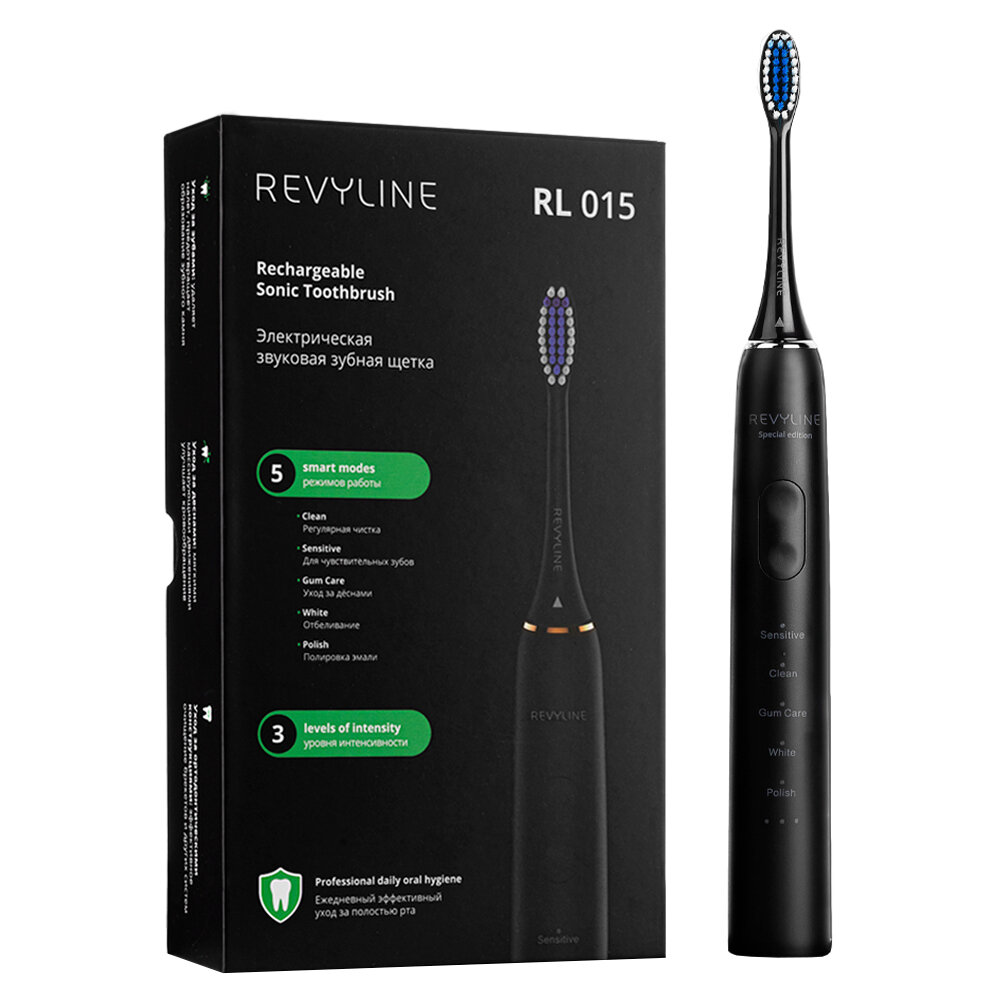 В комплектацию щетки входят 3 стандартные насадки с защитными колпачками, а также кожаный чехол с местом для транспортировки корпуса щетки и одной насадки. Revyline RL 015 оснащена аккумуляторной батареей емкостью в 2000 mAh, что позволяет использовать щетку до 90 дней без подзарядки. Заряд осуществляется от индукционной зарядной базы с выходом USB, время полной зарядки — 18 часов.