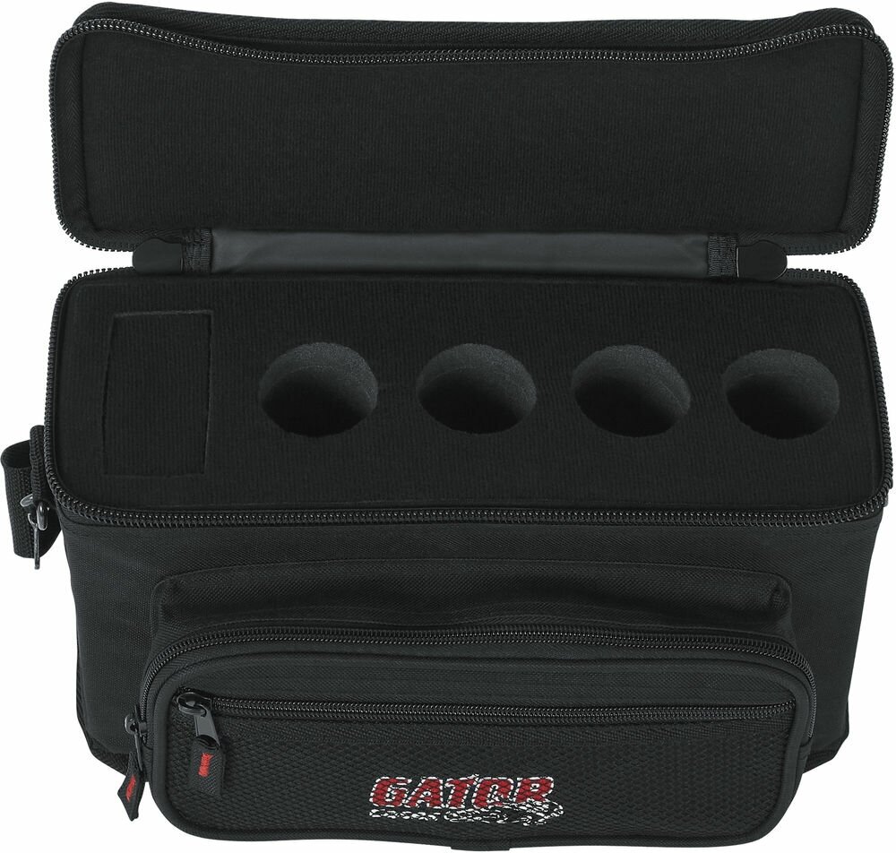 Полужесткий кейс с ручкой и плечевым ремнем для 4 микрофонов с отсеком для коммутации.