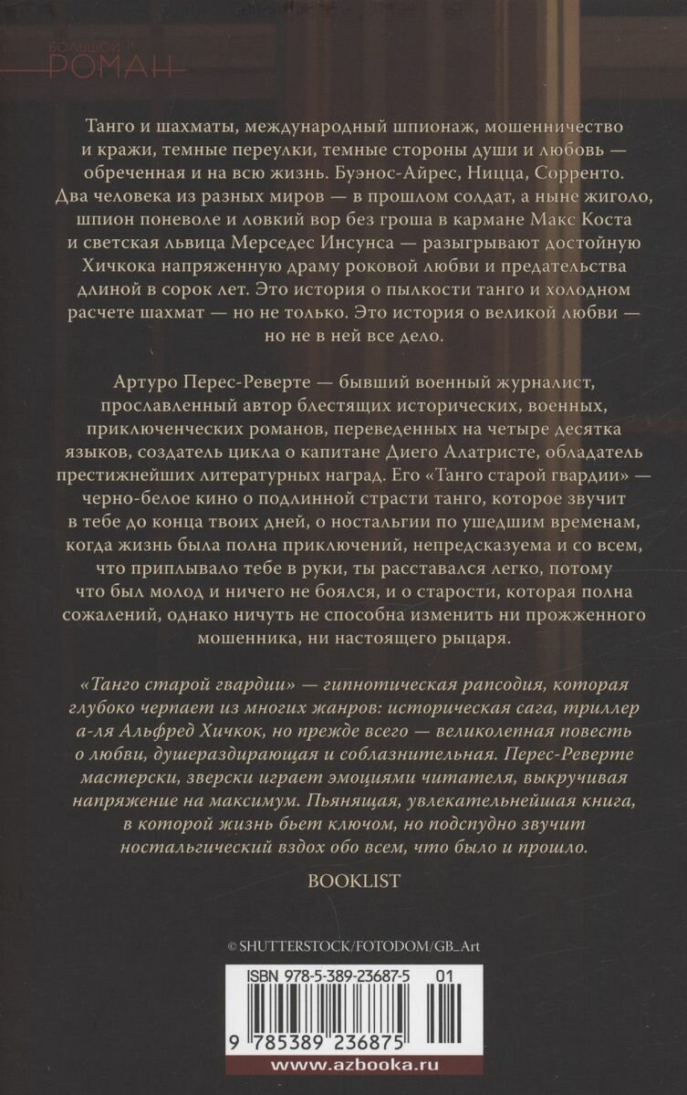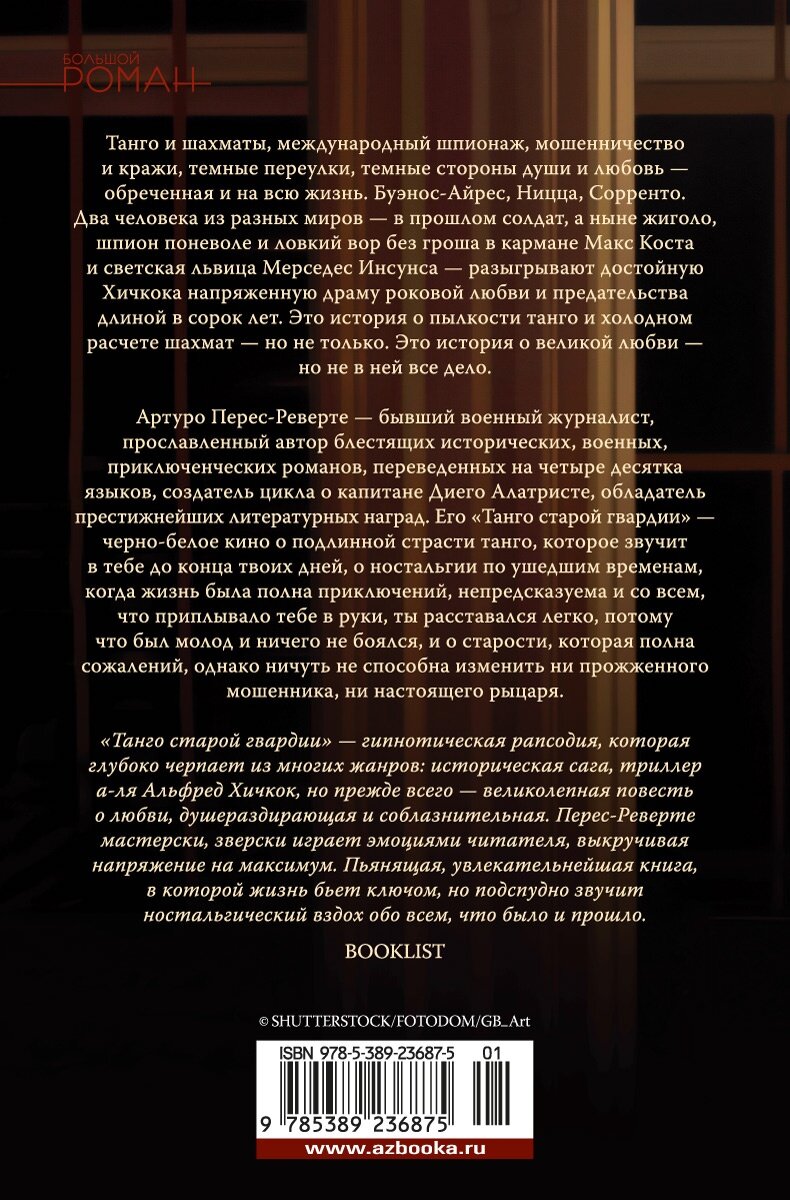 Танго и шахматы, международный шпионаж, мошенничество и кражи, темные переулки, темные стороны души и любовь — обреченная и на всю жизнь. Два человека из разных миров — в прошлом солдат, а ныне жиголо, шпион поневоле и ловкий вор без гроша в кармане Макс Коста и привычная к роскоши непроницаемая светская львица Мерседес Инсунса — разыгрывают достойную Хичкока напряженную драму роковой любви и предательства. Этим двоим выпали три короткие встречи: в 1920-е, в изысканных интерьерах трансатлантического лайнера и в трущобах Буэнос-Айреса; в 1930-е в Ницце, когда над Европой уже нависла тень всего, что предстояло; и в Сорренто, во время яростной схватки чилийского и советского гроссмейстеров за шахматную корону, в 1960-е, когда жизнь уже прошла и остается только не без зависти смотреть на молодых, ясноглазых и упорных, по возможности их поддерживая. Это история о пылкости танго и холодном расчете шахмат — но не только. Это история о великой любви — но не в ней все дело. Артуро Перес-Реверте — бывший военный журналист, прославленный автор блестящих исторических, военных, приключенческих романов, переведенных на сорок языков, создатель цикла о капитане Диего Алатристе, обладатель престижнейших литературных наград. Его «Танго старой гвардии» — черно-белое кино о подлинной страсти танго, которое звучит в тебе до конца твоих дней, о ностальгии по ушедшим временам, когда жизнь была полна приключений, непредсказуема и со всем, что приплывало тебе в руки, ты расставался легко, потому что был молод и ничего не боялся, и о старости, которая полна сожалений, однако ничуть не способна изменить ни прожженного мошенника, ни настоящего рыцаря.