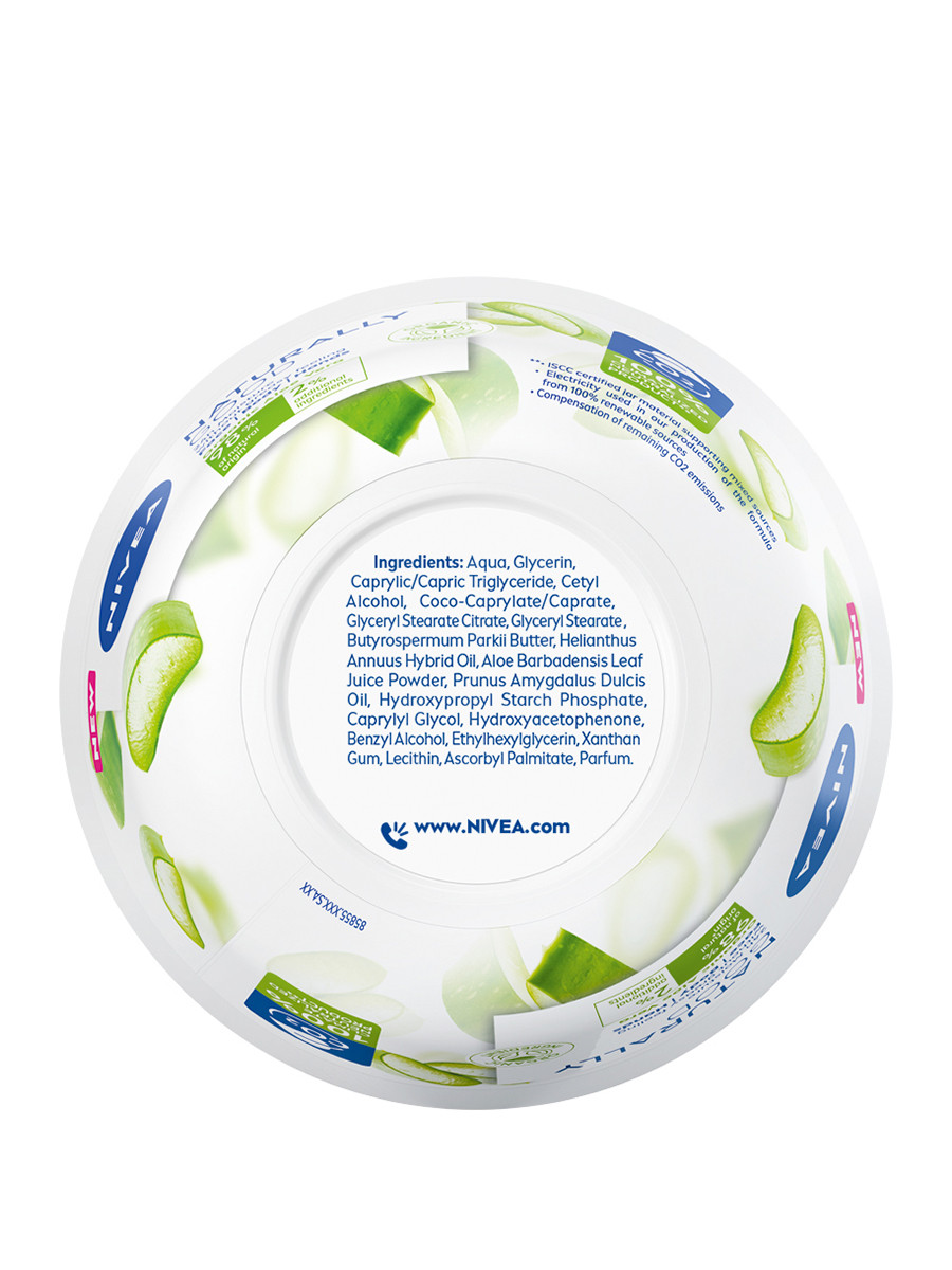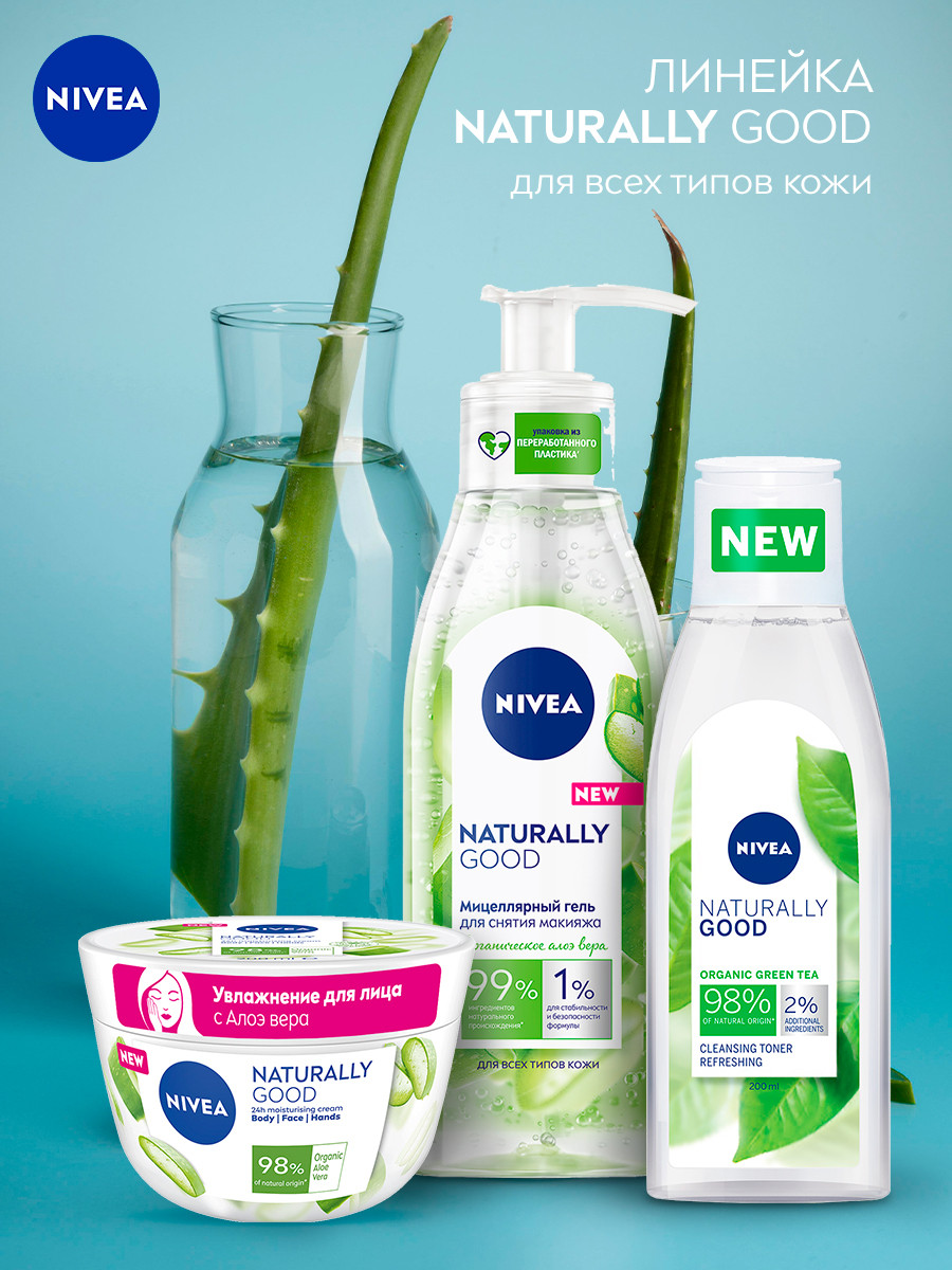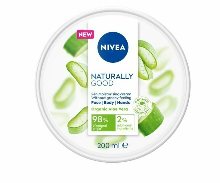 Натуральные ингредиенты, ответственный и устойчивый образ жизни - сегодня мы все больше внимания уделяем тому, чтобы делать что-то хорошее для себя и окружающей среды. Мы не должны пренебрегать этим в нашем уходе за кожей. Вдохновленный силой природы, новый увлажняющий крем Naturally Good ORGANIC ALOE VERA для всех типов кожи от NIVEA с трендовым ингредиентом алоэ вера в составе дарит увлажнение на весь день, быстро впитывается без ощущения жирности и отлично подойдет для ухода за кожей лица, рук и тела, так как представлен в значительном объеме - 200 мл. Упаковка крема Naturally Good ORGANIC ALOE VERA пригодна для вторичной переработки. С любовью к коже и окружающей среде: увлажняющий крем Naturally Good ORGANIC ALOE VERA для всех типов кожи от NIVEA. Способ применения: небольшое количество средства нанести тонким равномерным слоем на чистую кожу лица, шеи и зоны декольте мягкими массирующими движениями в течение 1-2 минут, дать впитаться. Дерматологически протестировано.