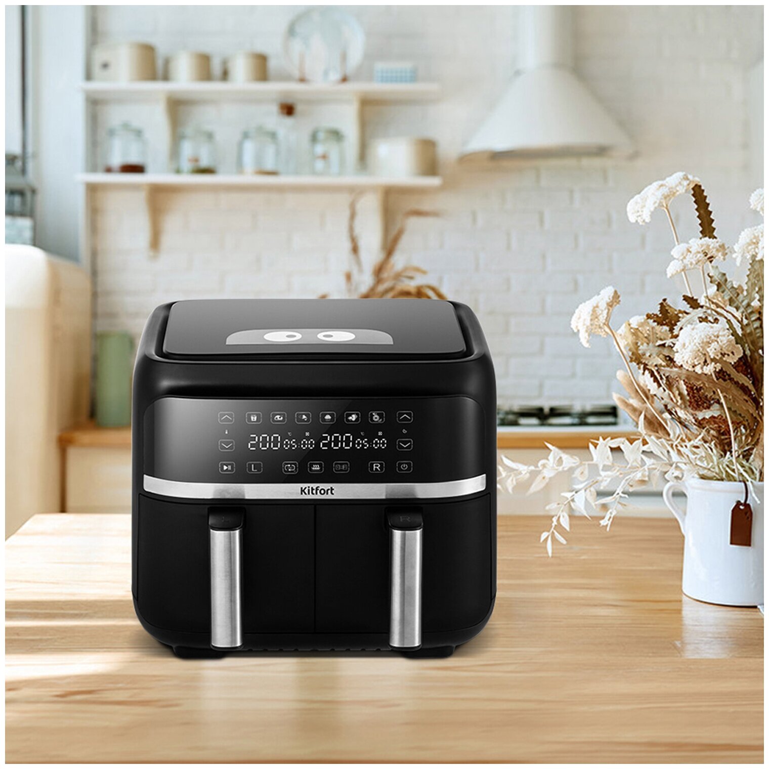 Современный аэрогриль с 2 раздельными нагревателями и 2 поддонами интересен стильным дизайном, а также позволяет готовить большинство продуктов без добавления масла, а также может использоваться как сушилка для фруктов и овощей. Главное его преимущество - наличие 2 нагревателей и 2 поддонов, что позволяет запекать 2 разных блюда одновременно, установив для каждого свои настройки t° и таймера. Вы можете готовить основное блюдо и гарнир к одному времени и подать к столу горячими. Продукты готовятся на решётках, которые вставляются в поддоны. Благодаря системе циркуляции горячего воздуха, продукты обжариваются равномерно со всех сторон, получаясь нежными внутри и с хрустящей корочкой снаружи. Аэрогриль оснащён сенсорным управлением, имеет 6 программ, синхронизацию приготовления и подогрев. Можно установить таймер до 60 мин и t° до 200°C для каждого нагревателя. На дисплее отображаются заданные параметры и какие нагреватели работают. Продукты готовятся на специальных решётках, установленных в поддоны. И решётки, и поддоны с антипригарным покрытием. В аэрогриле есть специальная программа для сушки овощей и фруктов с таймером от 1 до 24 часов и температурой от 40 до 80 градусов, что идеально подходит для этой задачи.