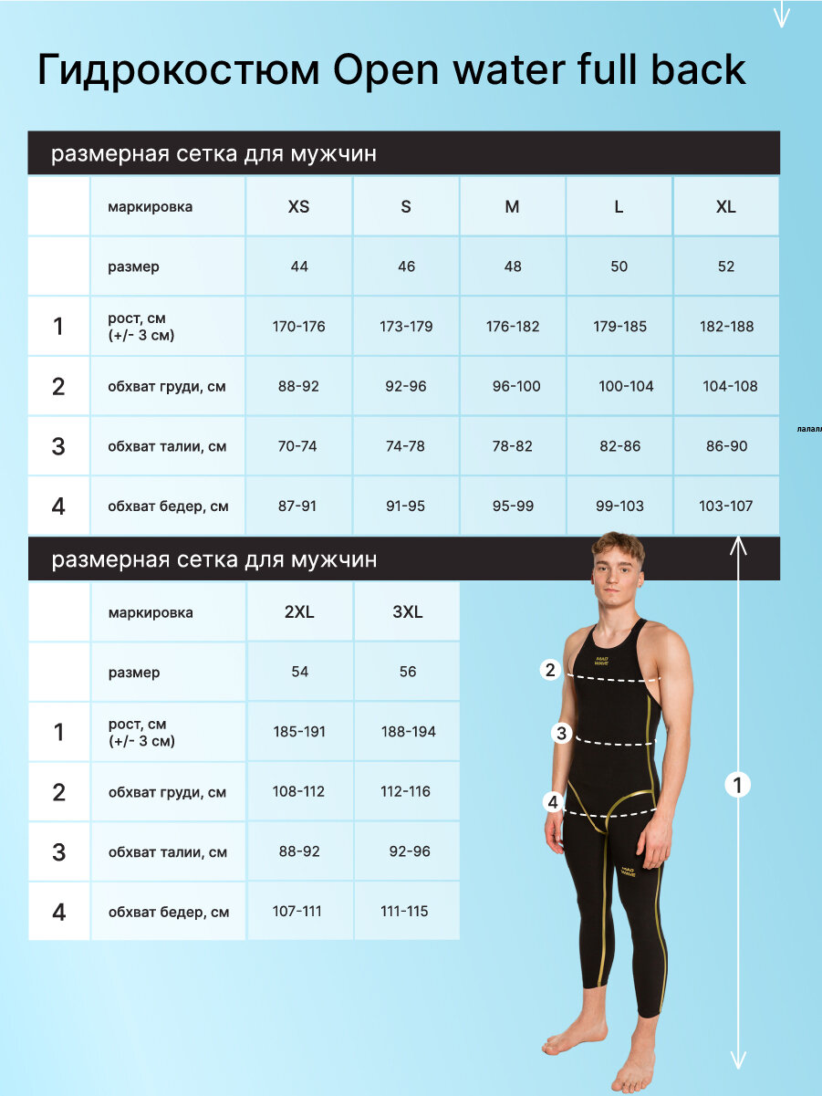 Гидрокостюм Open water full back с закрытой спиной разработан специально для соревнований на открытой воде. Благодаря отсутствию рукавов гидрокостюм не сковывает движения, сохраняя естественные ощущения при плавании, обеспечивая при этом оптимальную компрессию, устойчивость корпуса и наилучшее скольжение в воде. Клееные швы не создают дополнительного сопротивления, обеспечивают более высокую степень комфорта и превосходную гидродинамику. Гидрокостюм позволяет пловцу стабилизировать тело во время плавания и выравнивать положение во время совершения гребка, а также регулирует температуру тела, предохраняя спортсмена от переохлаждения. Оптимальная температура воды для плавания в гидрокостюме Open water full back от +20°C. Для лучшей фиксации по краю штанин с изнаночной стороны имеется силиконовая лента. особенности: Сверхпрочные швы – технология двусторонней проклейки швов повышает прочность гидрокостюма более чем в x2 раза; Сетчатая структура ткани с применением усиленных волокон полиэстера – равномерная компрессия без утяжеления ткани; Клееная структура швов – обеспечивает наилучшее скольжение в воде; Закрытый тип спины – максимальная компрессия и улучшенные гидродинамические свойства; FINA approved – гидрокостюм сертифицирован федерацией FINA для участия в международных соревнованиях.