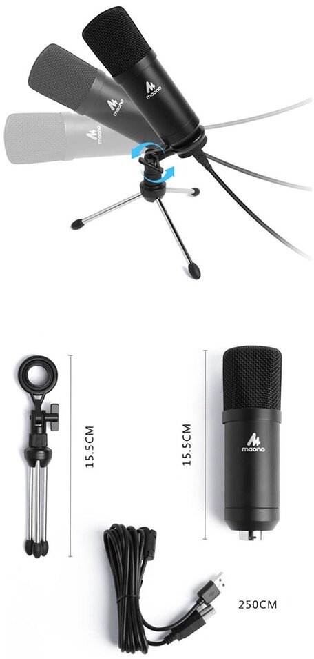 Микрофонный комплект MAONO способен обеспечить достижения чистого звука в студийных условиях. Для подключения к ПК и прочей аппаратуре в используется съемный кабель, который отличается увеличинной длиной 2,5 метра и разъемом USB.