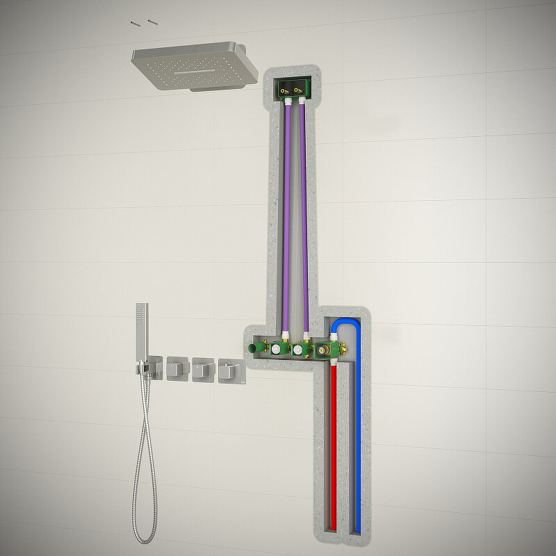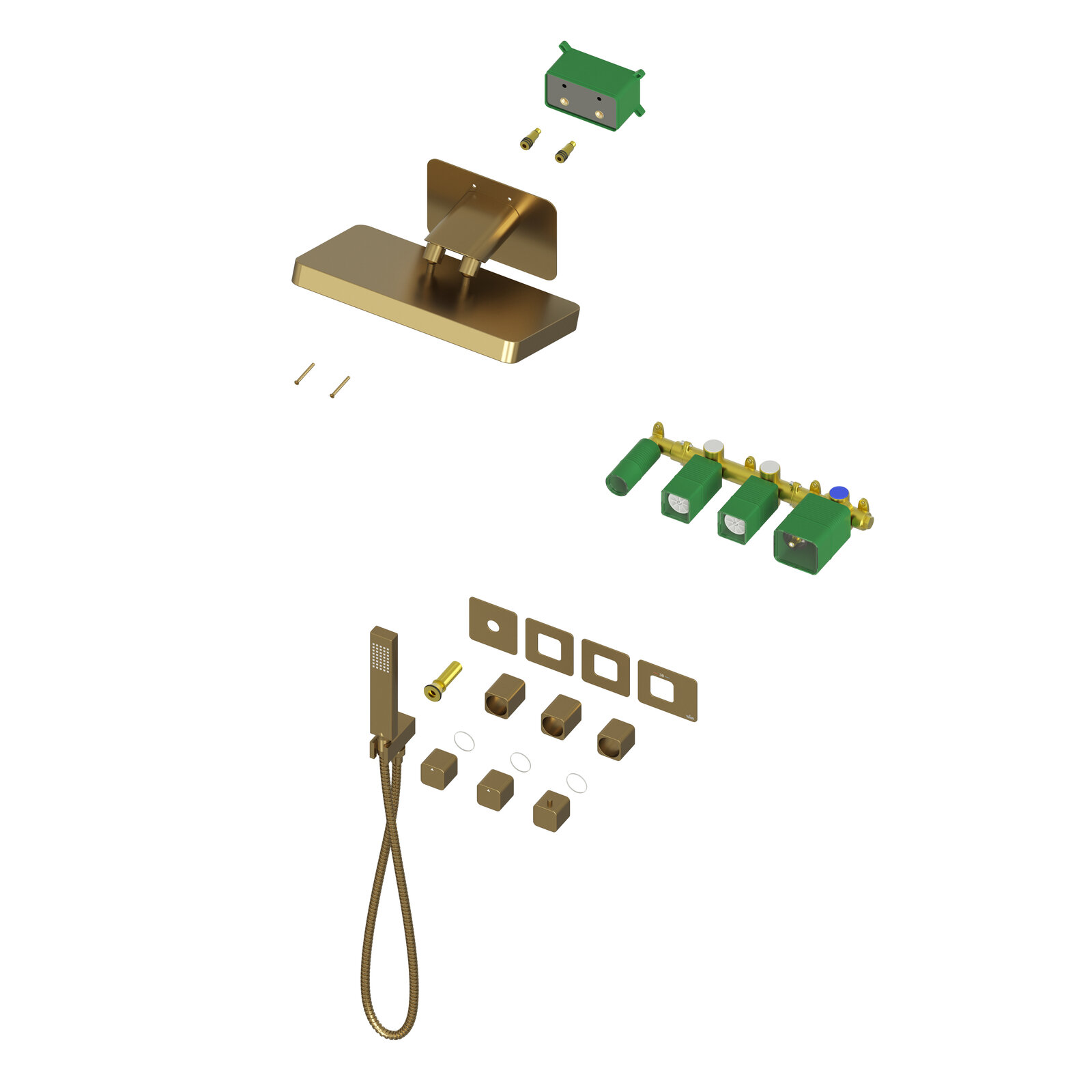 Встраиваемый блок управления душевой системой - 1 шт. Декоративные накладки - 4 шт. Декоративные гильзы - 3 шт. Ручка управления термостатом - 1 шт. Ручки управления режимами (дивертор) - 2 шт. Соединительная трубка с резьбой (латунная) - 1 шт. Держатель ручной лейки с подключением шланга душа (латунный) - 1 шт. Ручная лейка (латунная) - 1 шт. Шланг душа 1,5 м (латунный) - 1 шт. Встраиваемый блок для монтажа верхнего душа - 1 шт. Соединительные трубки для установки тропического душа - 2 шт. Пробки для проверки давления (герметичность) тропического душа - 2 шт. Защитная крышка - 1 шт. Тропический душ 2-х режимный (пластик) - 1 шт. Крепежные винты для фиксации тропического душа - 2 шт. Инструкция - 1 шт.