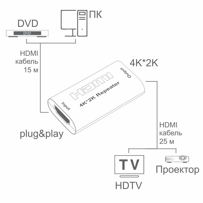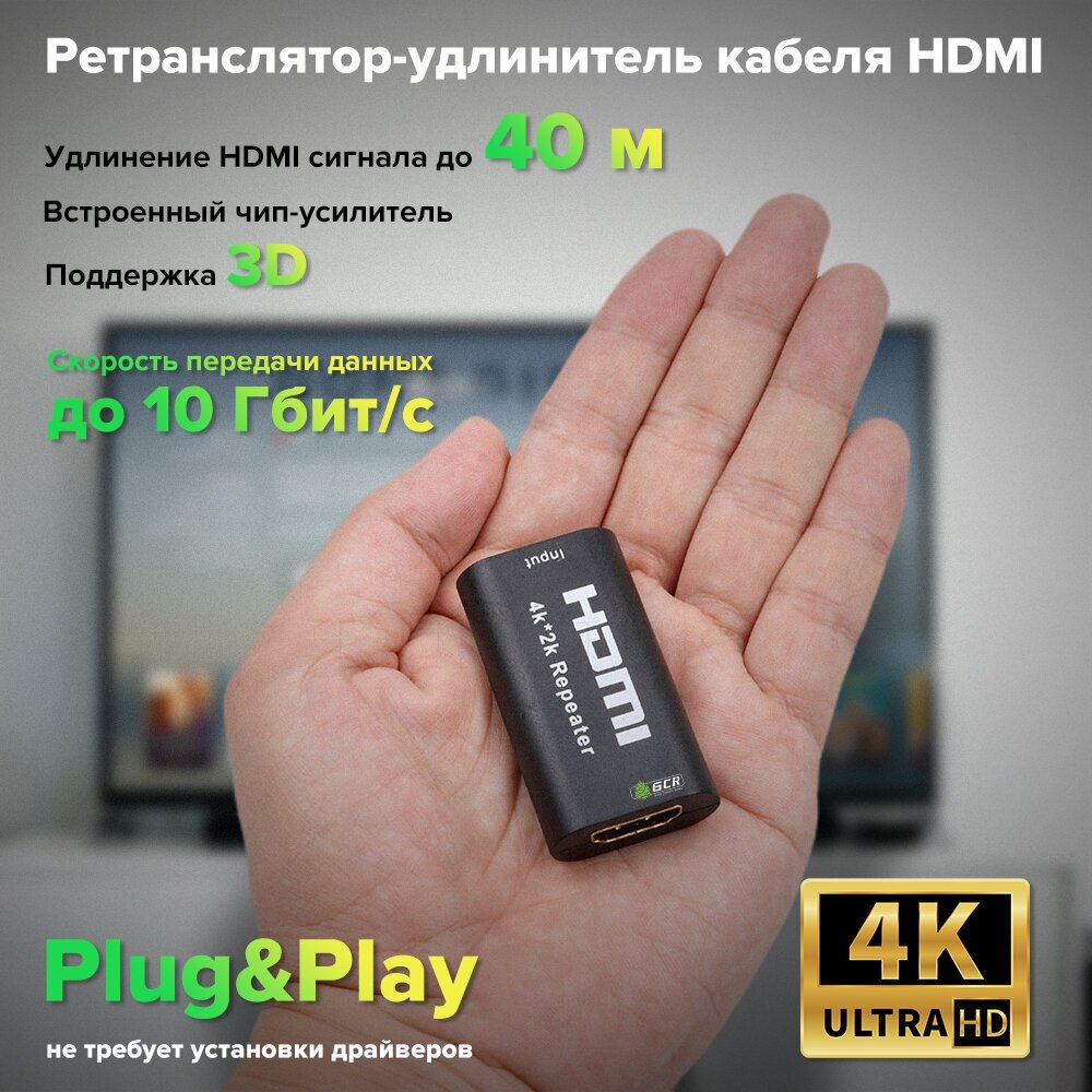 Ретранслятор-удлинитель предназначен для соединения двух HDMI кабелей и усиления HDMI сигнала. Поможет передать высококачественный сигнал на расстояние до 40 метров от устройства-источника. Встроенный усилитель сигнала позволит наслаждаться максимально качественной картинкой. Идеальный выбор для домашнего кинотеатра, мультимедиа демонстрационного оборудования, PlayStation, HDTV и т.д. Устройство поддерживает передачу видео сигнала высокого разрешения, передает 3D и обладает пропускной способностью до 10 Гбит/с. Прост в подключении и не требует установки драйверов или другого ПО. Не нуждается в подключении дополнительного питания. Удлинитель поддерживает разрешения до 4Kx2K, передачу 3D, совместим с HDCP 1.4. Обратите внимание, продлить расстояние HDMI сигнала до 40 метров возможно только при использовании кабеля хорошего качества со значением AWG не более 26.