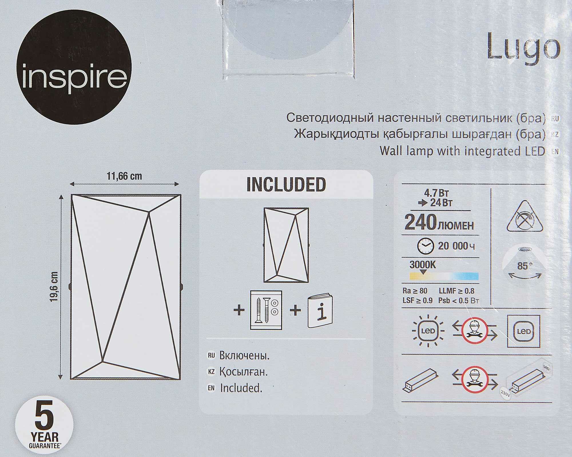 **Бра светодиодный Inspire Lugo** идеально подойдет для гостиной, прихожей, лестницы. Благодаря своему дизайнерскому стилю привнесет современный штрих в ваш интерьер. Этот продукт интегрирован светодиодами. Его теплый белый свет (3000K) привнесет уют в вашу комнату. Форма плафона создает красивый световой эффект на вашей стене, в верхней и нижней части изделия.
