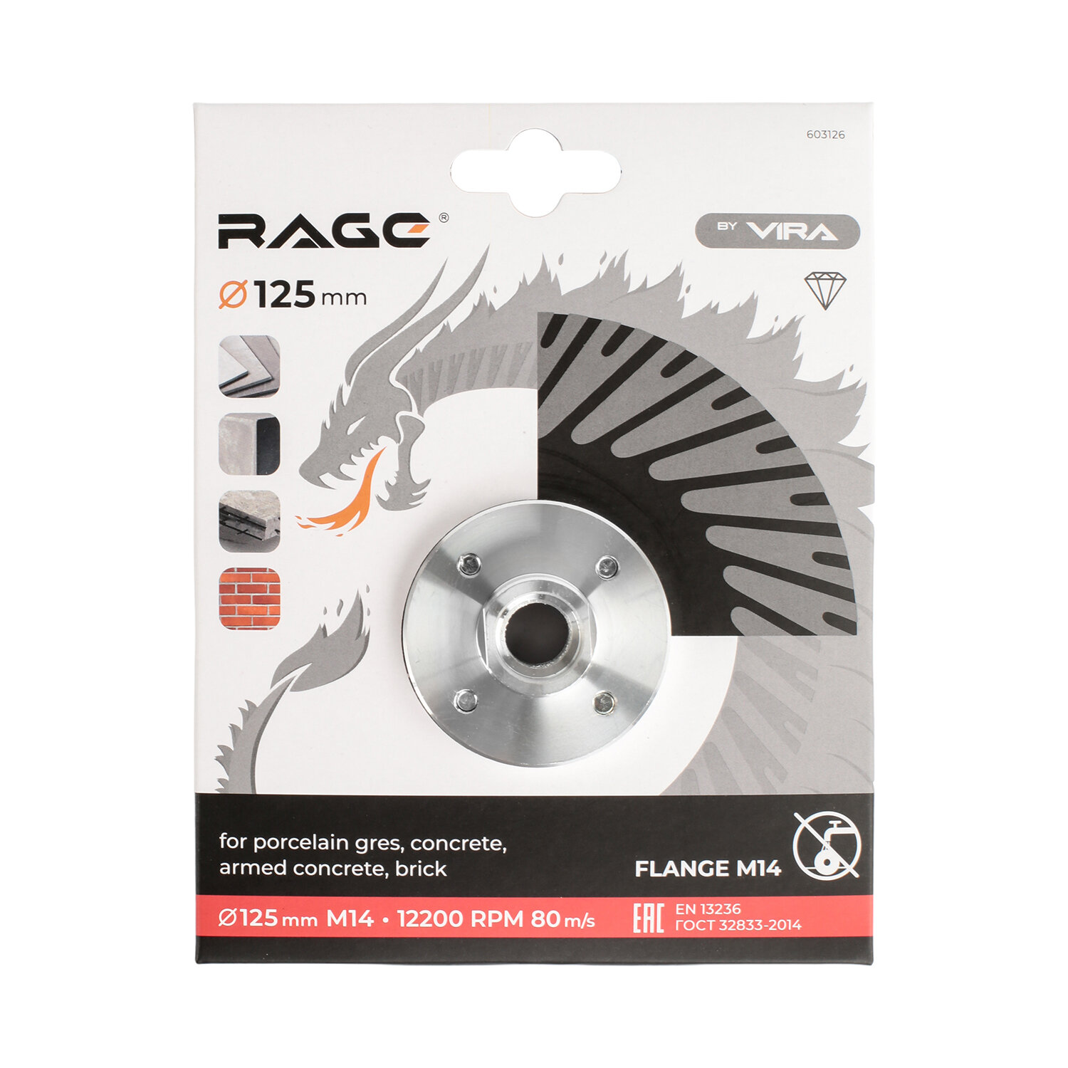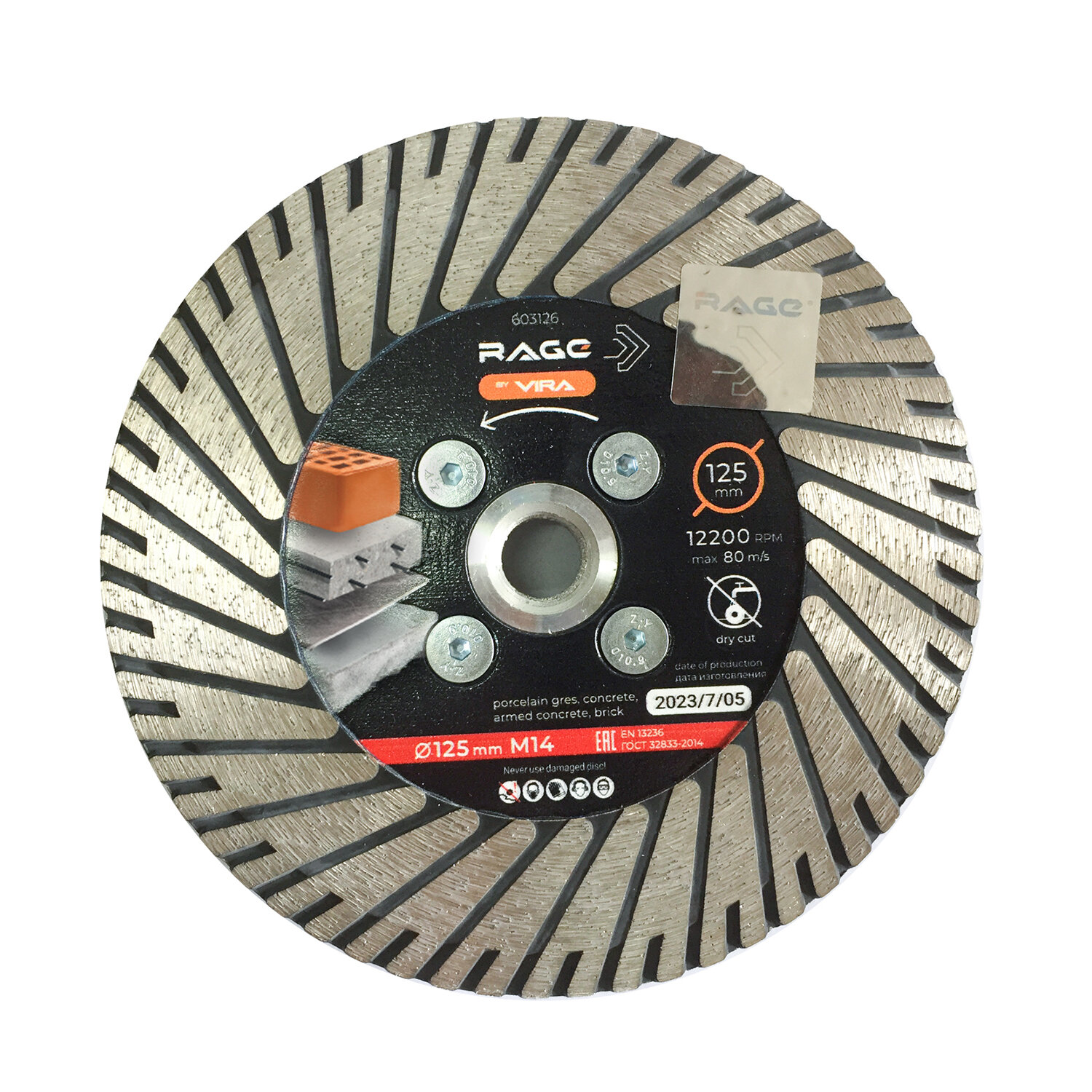 **Диск алмазный турбо с фланцем Rage** применяется для резки, шлифовки торцов и снятия фаски 45 градусов. Незаменим при снятии фасок на торцах плитки под 45 градусов для качественной стыковки плитки при проведении облицовочных работ. Так же позволяет отшлифовать и выровнять торцы плитки после подрезки. Возможно использовать для сухой резки и с водяным охлаждением. Фланец придает диску жесткость и делает работу более точной.