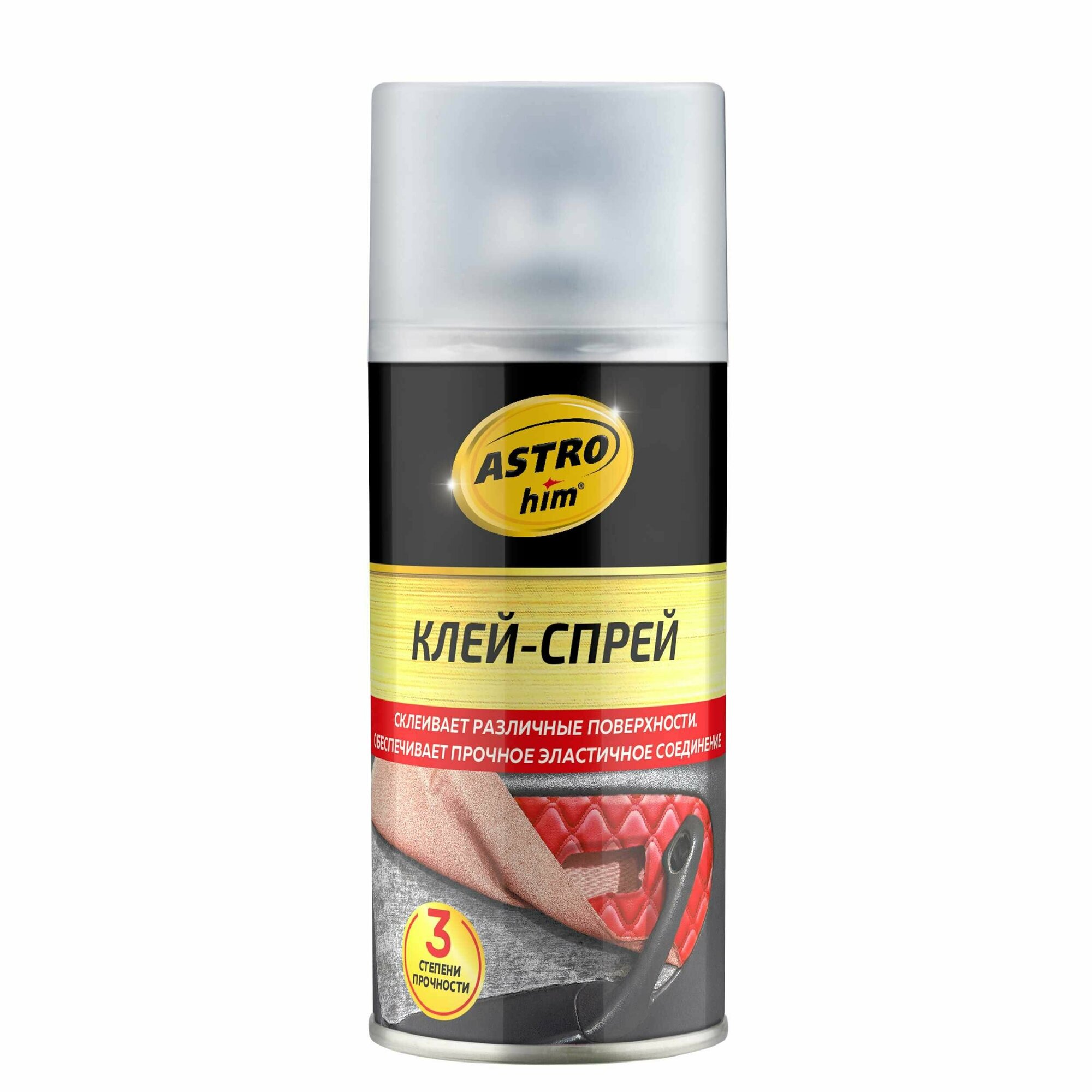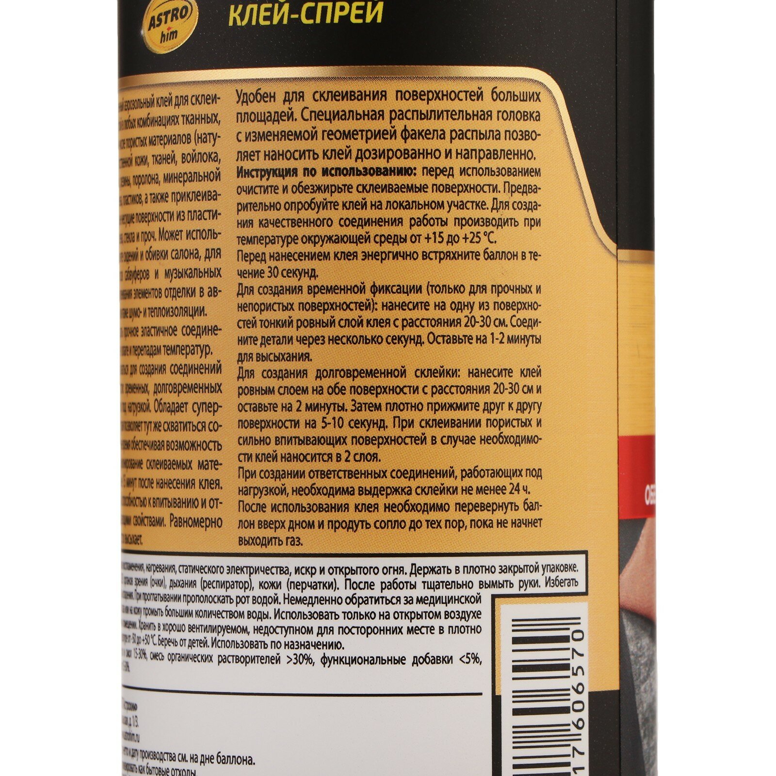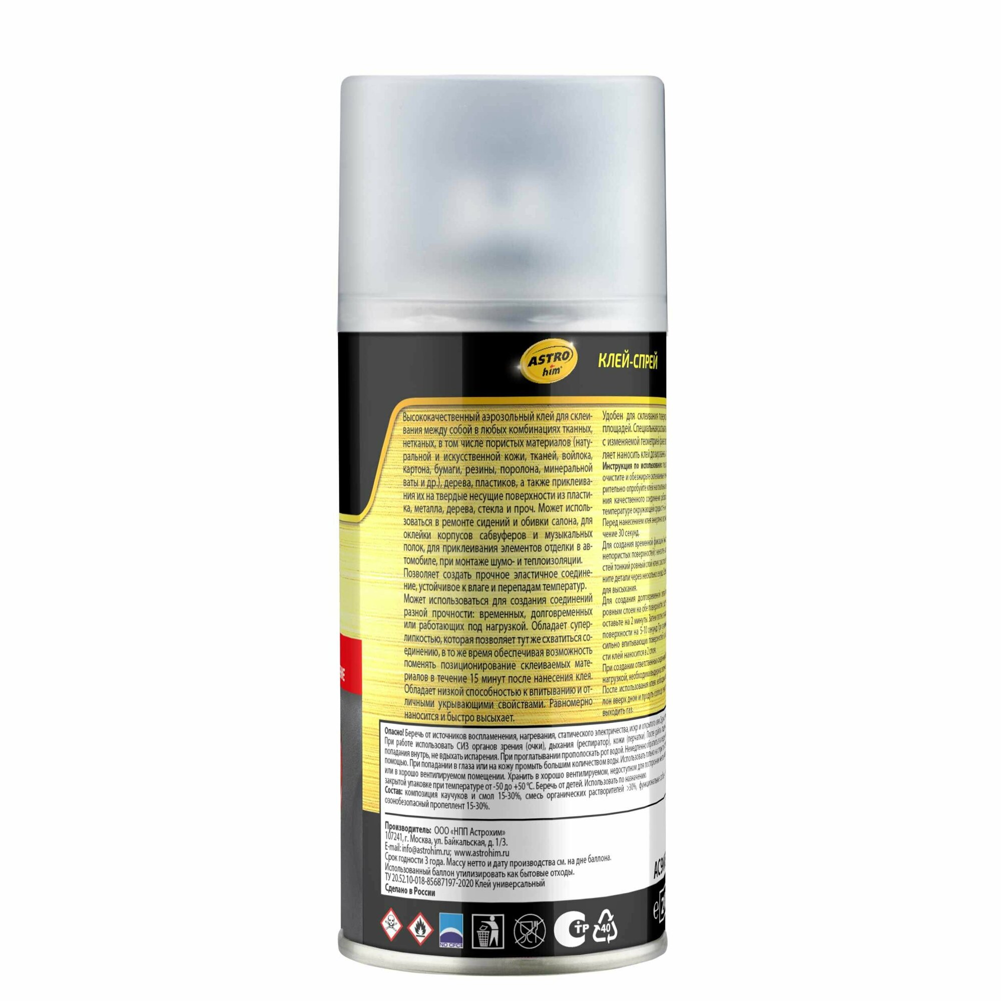 **Клей-спрей Astrohim** — универсальный аэрозольный состав, который позволяет склеить между собой поверхности из различных материалов: тканных и нетканых. Это натуральная и искусственная кожа, резина, бумага, картон, поролон, дерево, пластик, пластик и прочие. Подходит для ремонта сидений и обивки автомобильного салона, склейки корпусов различных приборов, фиксации элементов отделки в интерьере, при монтаже шумо- и теплоизоляционных покрытий и многих других задач. Формирует прочное и износостойкое покрытие, которое имеет высокую устойчивость к влагу и температурным перепадам. Подходит для создания соединений: временных, долговременных, работающих под нагрузкой. Состав схватывается очень быстро. Поменять позиционирование склеиваемых деталей можно в течение 15 минут после того, как клей был нанесен. Перед применением склеиваемые поверхности нужно очистить и обезжирить. Рекомендуется предварительно опробовать средство на локальном участке. Перед использованием нужно энергично встряхнуть баллон с содержимым в течение полуминуты. Хранить вдали от источников воспламенения, нагревания и статического электричества, а также открытого огня и искр.